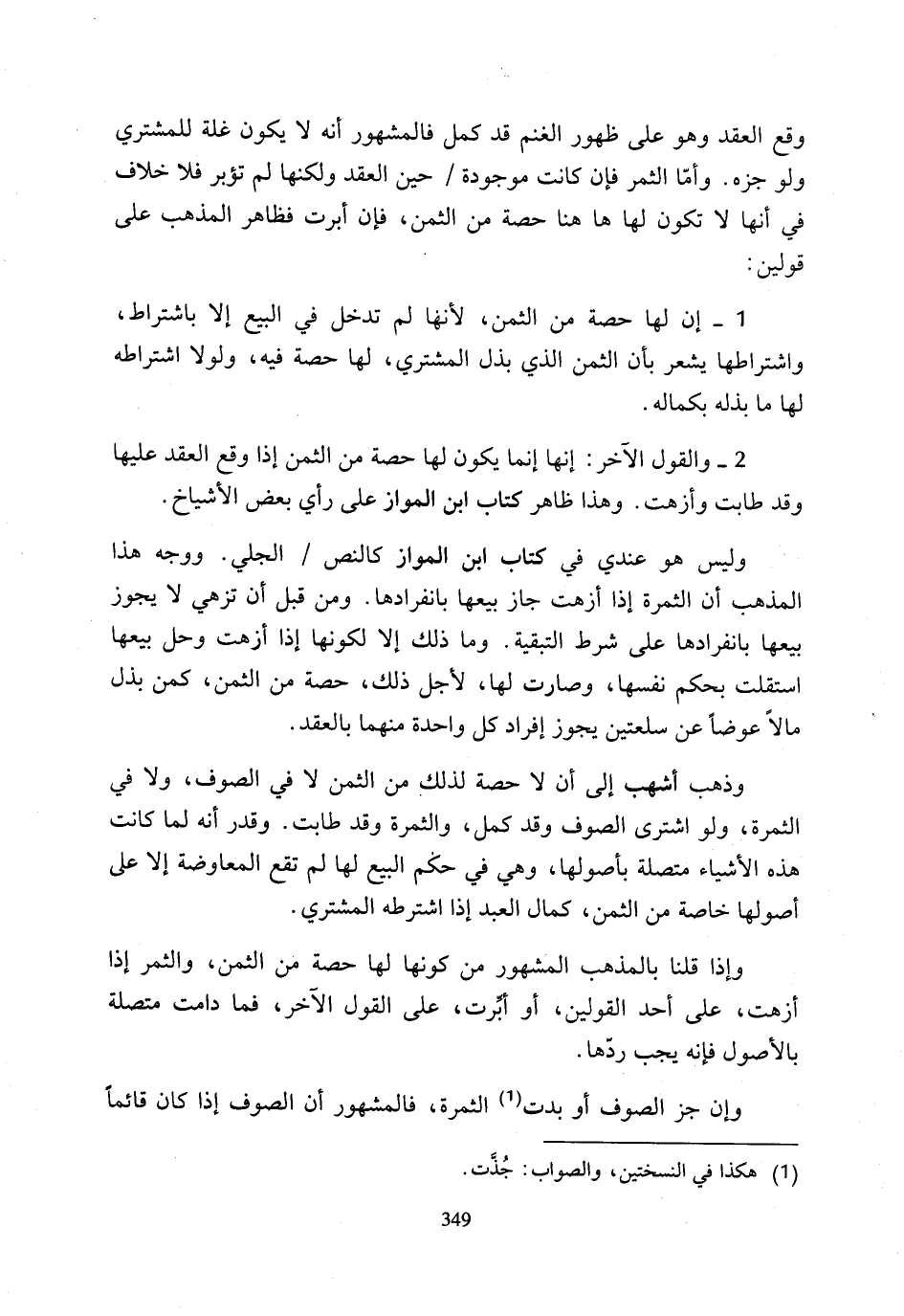 وليس هو عندي في كتاب ابن المواز كالنص الجلي. ووجه هذا المذهب أن الثمرة إذا أزهت جاز بيعها بانفرادها. ومن قبل أن تزهي لا يجوز بيعها بانفرادها على شرط التبقية. وما ذلك إلا لكونها إذا أزهت وحل بيعها استقلت بحكم نفسها، وصارت لها، لأجل ذلك، حصة من الثمن، كمن بذل مالًا عوضًا عن سلعتين يجوز إفراد كل واحدة منهما بالعقد.