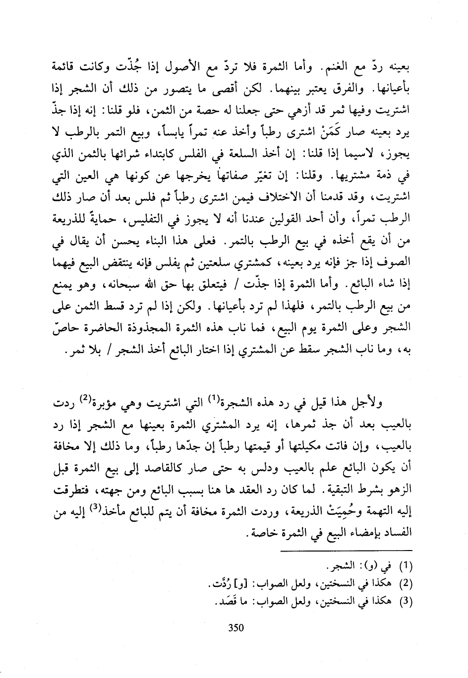 بعينه ردّ مع الغنم. وأما الثمرة فلا تردّ مع الأصول إذا جُذّت وكانت قائمة بأعيانها. والفرق يعتبر بينهما. لكن أقصى ما يتصور من ذلك أن الشجر إذا اشتريت وفيها ثمر قد أزهي حتى جعلنا له حصة من الثمن، فلو قلنا: إنه إذا جذّ يرد بعينه صار كَمَنْ اشترى رطبًا وأخذ عنه تمرًا يابسًا، وبيع التمر بالرطب لا يجوز، لا سيما إذا قلنا: إن أخذ السلعة في الفلس كابتداء شرائها بالثمن الذي في ذمة مشتريها. وقلنا: إن تغيّر صفاتها يخرجها عن كونها هي العين التي اشتريت، وقد قدمنا أن الاختلاف فيمن اشترى رطبًا ثم فلس بعد أن صار ذلك الرطب تمرًا، وأن أحد القولين عندنا أنه لا يجوز في التفليس، حمايةً للذريعة من أن يقع أخذه في بيع الرطب بالتمر. فعلى هذا البناء يحسن أن يقال في الصوف إذا جز فإنه يرد بعينه، كمشتري سلعتين ثم يفلس فإنه ينتقض البيع فيهما إذا شاء البائع. وأما الثمرة إذا جذّت فيتعلق بها حق الله سبحانه، وهو يمنع من بيع الرطب بالتمر، فلهذا لم ترد بأعيانها. ولكن إذا لم ترد قسط الثمن على الشجر وعلى الثمرة يوم البيع، فما ناب هذه الثمرة المجذوذة الحاضرة حاصّ به، وما ناب الشجر سقط عن المشتري إذا اختار البائع أخذ الشجر بلا ثمر.