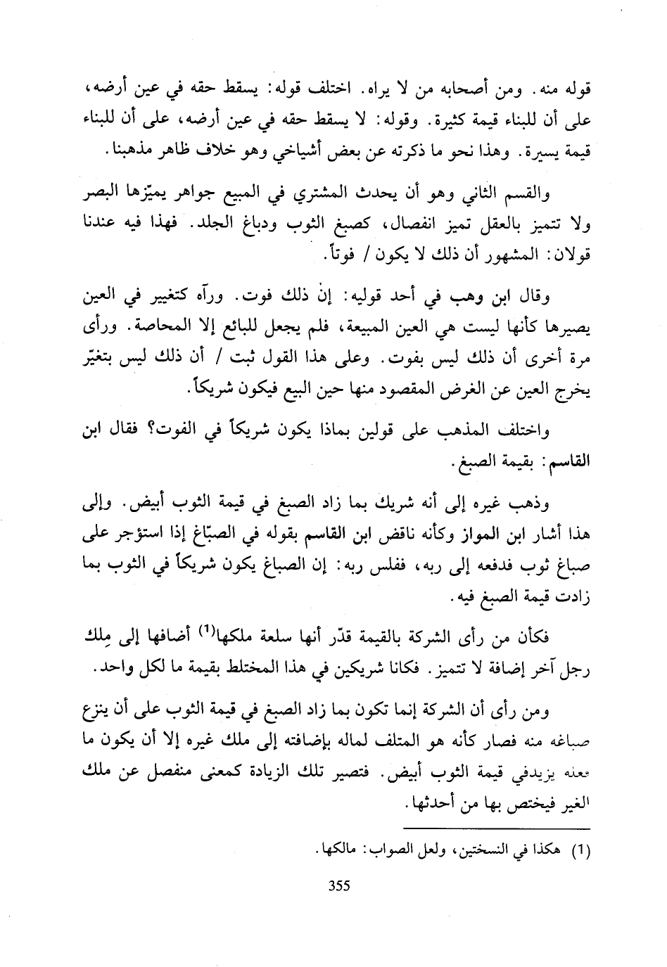 وقال ابن وهب في أحد قوليه: إن ذلك فوت. ورآه كتغيير في العين يصيرها كأنها ليست هي العين المبيعة، فلم يجعل للبائع إلا المحاصة. ورأى مرة أخرى أن ذلك ليس بفوت. وعلى هذا القول ثبت أن ذلك ليس بتغيّر يخرج العين عن الغرض المقصود منها حين البيع فيكون شريكًا.
