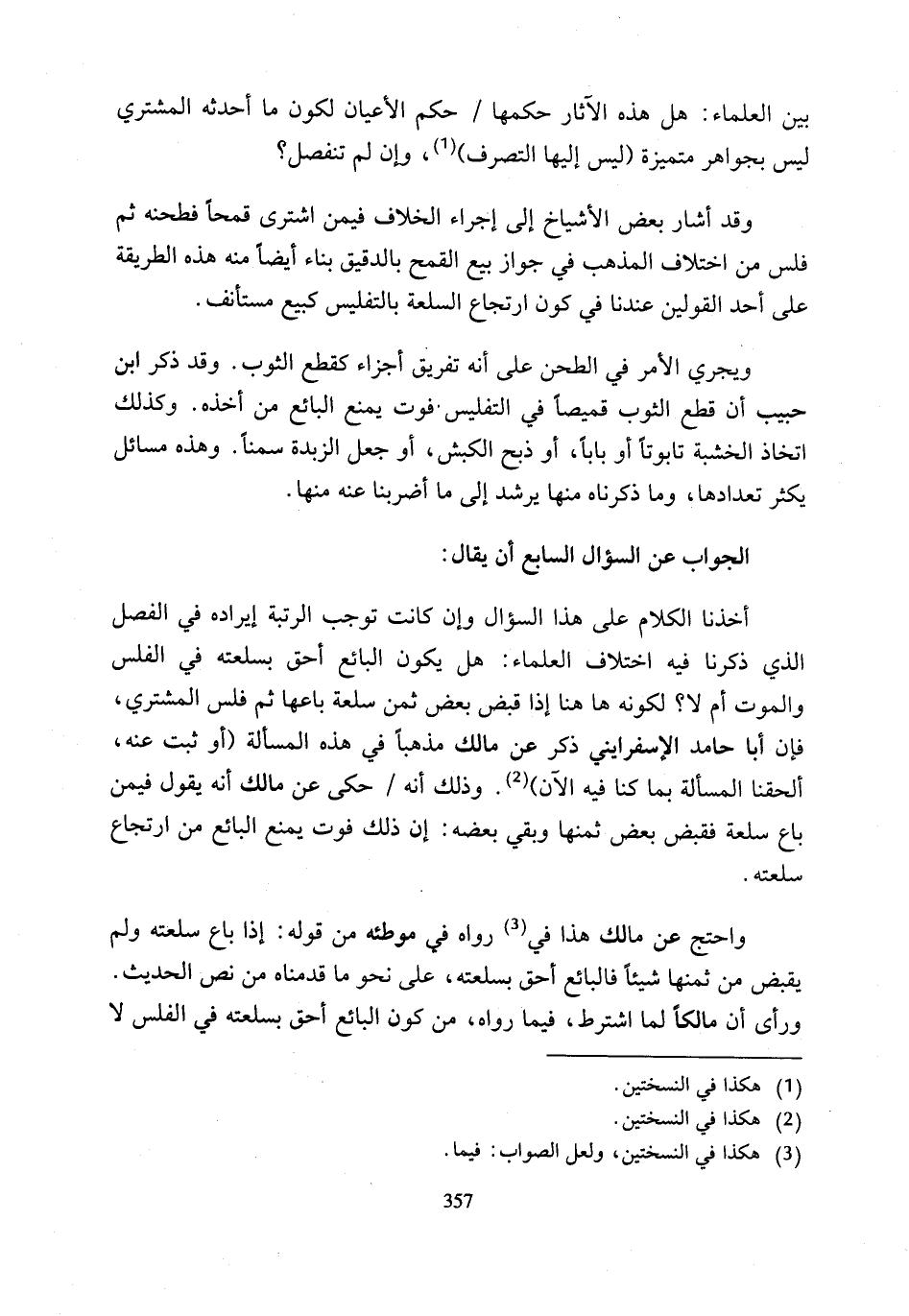 أخذنا الكلام على هذا السؤال وإن كانت توجب الرتبة إيراده في الفصل الذي ذكرنا فيه اختلاف العلماء: هل يكون البائع أحق بسلعته في الفلس والموت أم لا؟ لكونه ها هنا إذا قبض بعض ثمن سلعة باعها ثم فلس المشتري، فإن أبا حامد الإسفرايني ذكر عن مالك مذهبًا في هذه المسألة (أو ثبت عنه، ألحقنا المسألة بما كنا فيه الآن) (¬2). وذلك أنه حكى عن مالك أنه يقول فيمن باع سلعة فقبض بعض ثمنها وبقي بعضه: إن ذلك فوت يمنع البائع من ارتجاع سلعته.