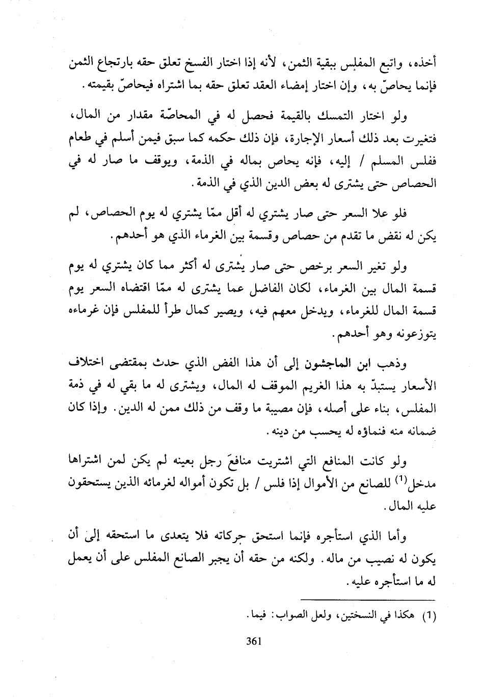 وذهب ابن الماجشون إلى أن هذا الفض الذي حدث بمقتضى اختلاف الأسعار يستبدّ به هذا الغريم الموقف له المال، ويشترى له ما بقي له في ذمة المفلس، بناء على أصله، فإن مصيبة ما وقف من ذلك ممن له الدين. وإذا كان ضمانه منه فنماؤه له يحسب من دينه.