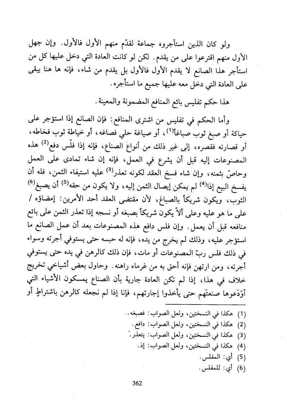 وأما الحكم في تفليس من اشترى المنافع: فإن الصانع إذا استؤجر على حياكة أو صبغ ثوب صباغًا (¬1)، أو صياغة حلي فصاغه، أو خياطة ثوب فخاطه، أو قصارته فقصره، إلى غير ذلك من أنواع الصناع، فإنه إذا فلّس دفع (¬2) هذه المصنوعات إليه قبل أن يشرع في العمل، فإنه إن شاء تمادى على العمل وحاصّ بثمنه، وإن شاء فسخ العقد لكونه تعذر (¬3) عليه استيفاء الثمن، فله أن يفسخ البيع إذا (¬4) لم يمكن إيصال الثمن إليه، ولا يكون من حقه (¬5) أن يصبغ (¬6) الثوب، ويكون شريكًا بالصباغ؛ لأن مقتضى العقد أحد الأمرين: إمضاؤه على ما هو عليه وعلى ألاّ يكون شريكًا بصبغه أو نسجه إذا تعذر الثمن على بائع منافعه قبل أن يعمل. وإن فلس دافع هذه المصنوعات بعد أن عمل الصانع ما استؤجر عليه، وذلك لم يخرج من يده، فإنه له حبسه حتى يستوفي أجرته وسواء في ذلك فلس ربّ المصنوعات أو مات، فإن ذلك كالرهن في يده حتى يستوفي أجرته، ومن ارتهن فإنه أحق به من غرماء راهنه. وحاول بعض أشياخي تخريج خلاف في هذا، إذا لم تكن العادة جارية بأن الصناع يمسكون الأشياء التي أوْدَعوها صنعتَهم حتى يأخذوا إجارتهم، فإنا إذا لم نجعله كالرهن باشتراطٍ أو