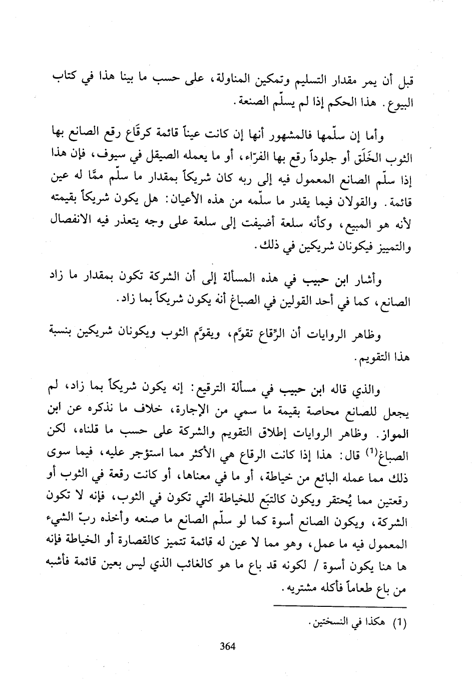 وأشار ابن حبيب في هذه المسألة إلى أن الشركة تكون بمقدار ما زاد الصانع، كما في أحد القولين في الصباغ أنه يكون شريكًا بما زاد.