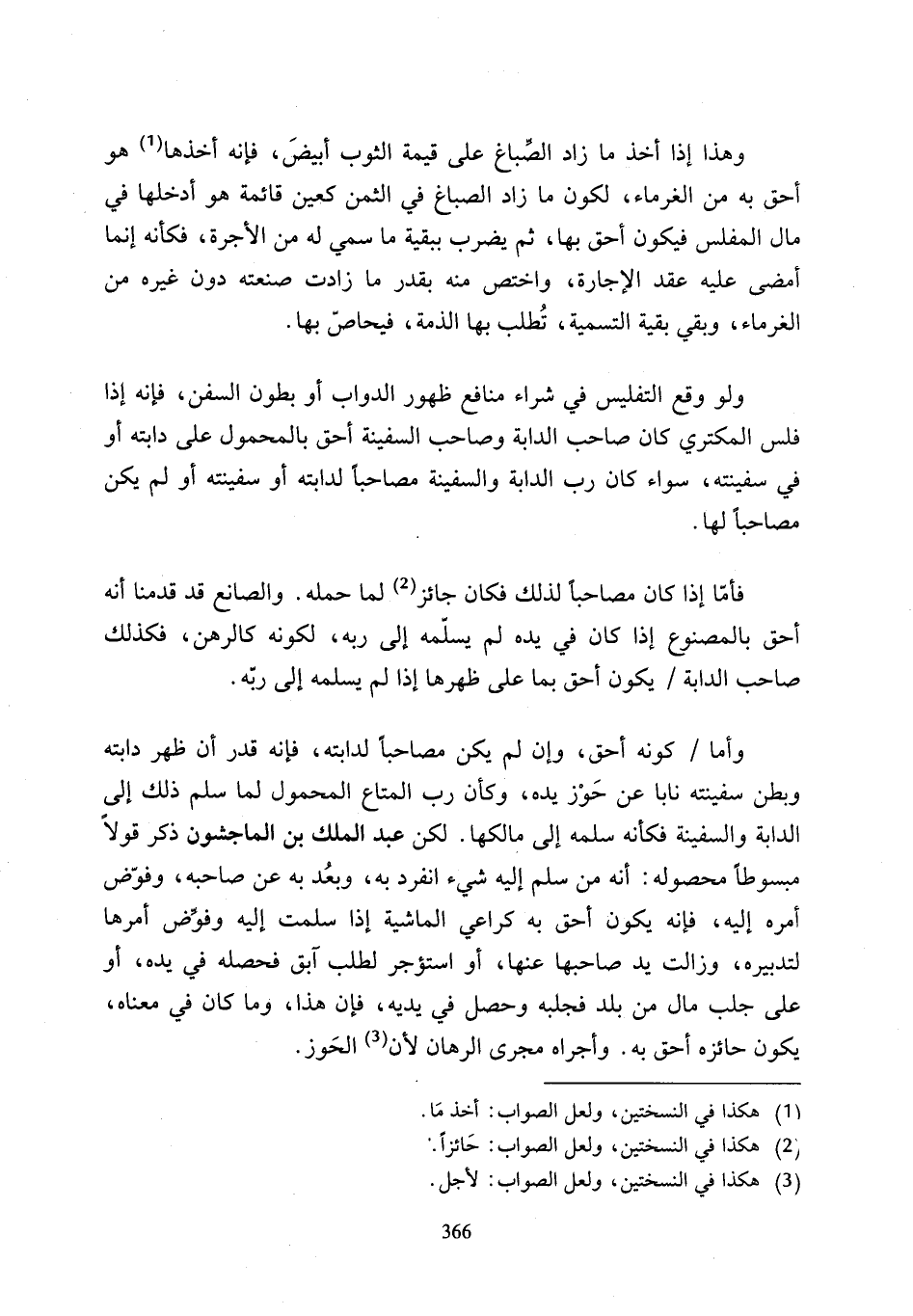 وأما كونه أحق، وإن لم يكن مصاحبًا لدابته، فإنه قدر أن ظهر دابته وبطن سفينته نابا عن حَوْز يده، وكأن رب المتاع المحمول لما سلم ذلك إلى الدابة والسفينة فكأنه سلمه إلى مالكها. لكن عبد الملك بن الماجشون ذكر قولًا مبسوطًا محصوله: أنه من سلم إليه شيء انفرد به، وبعُد به عن صاحبه، وفوّض أمره إليه، فإنه يكون أحق به كراعي الماشية إذا سلمت إليه وفوِّض أمرها لتدبيره، وزالت يد صاحبها عنها، أو استؤجر لطلب آبق فحصله في يده، أو على جلب مال من بلد فجلبه وحصل في يديه، فإن هذا، وما كان في معناه، يكون حائزه أحق به. وأجراه مجرى الرهبان لأن (¬3) الحَوز.
