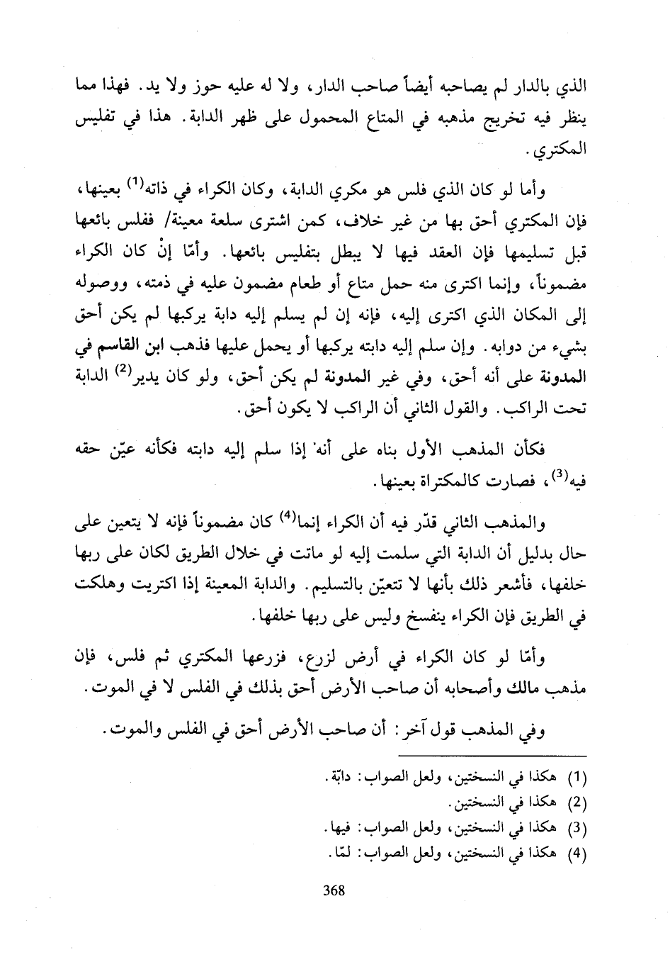والمذهب الثاني قدّر فيه أن الكراء إنما (¬4) كان مضمونًا فإنه لا يتعين على حال بدليل أن الدابة القياسلمت إليه لو ماتت في خلال الطريق لكان على ربها خلفها، فأشعر ذلك بانها لا تتعيّن بالتسليم. والدابة المعينة إذا اكتريت وهلكت في الطريق فإن الكراء ينفسخ وليس على ربها خلفها.