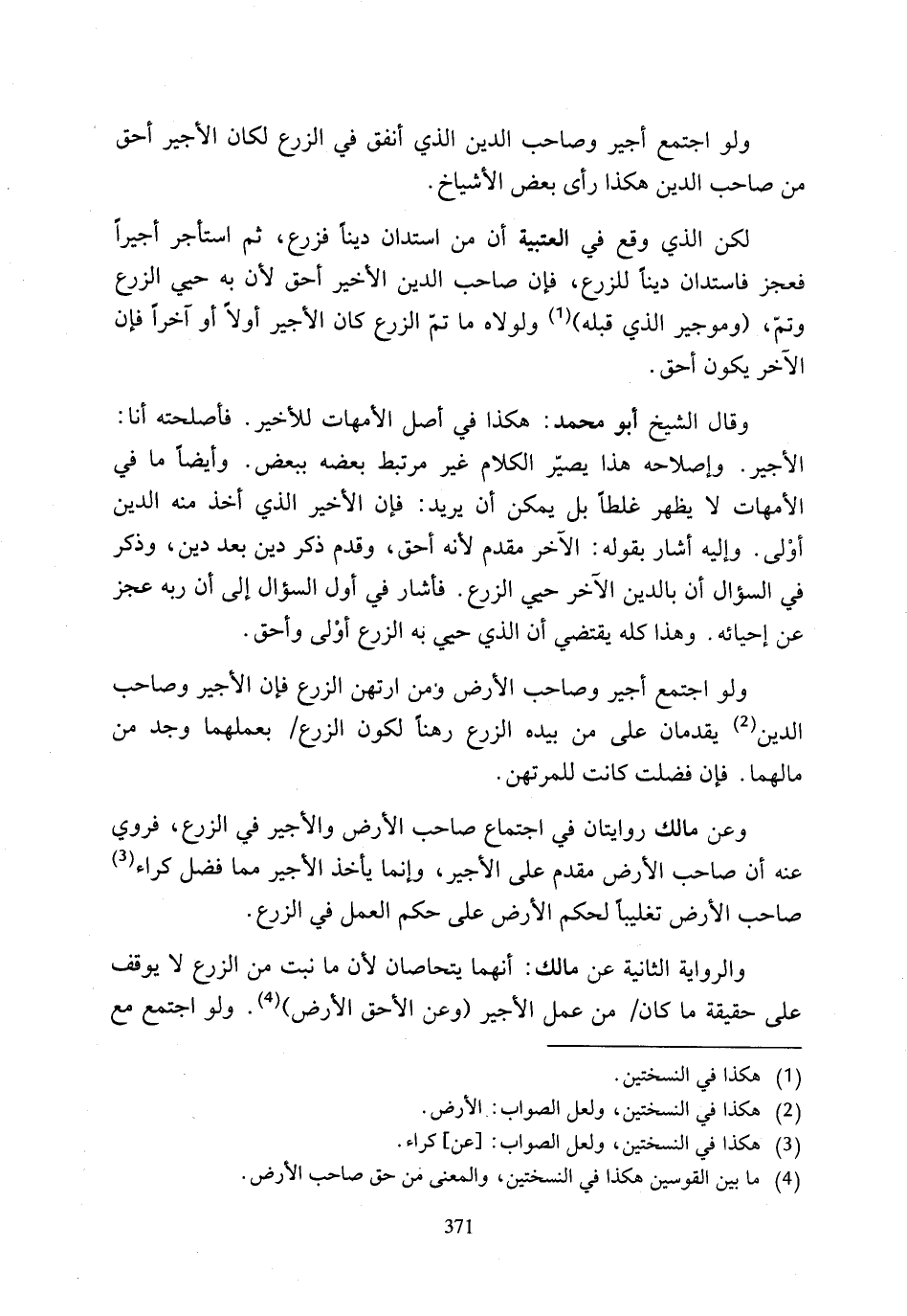 وقال الشيخ أبو محمَّد: هكذا في أصل الأمهات للأخير. فأصلحته أنا: الأجير. وإصلاحه هذا يصيّر الكلام غير مرتبي بعضه ببعض. وأيضًا ما في الأمهات لا يظهر غلطًا بل يمكن أن يريد: فإن الأخير الذي أخذ منه الدين أوْلى. وإليه أشار بقوله: الآخر مقدم لأنه أحق، وقدم ذكر دين بعد دين، وذكر في السؤال أن بالدين الآخر حيي الزرع. فأشار في أول السؤال إلى أن ربه عجز عن إحيائه. وهذا كله يقتضي أن الذي حيي به الزرع أوْلى وأحق.