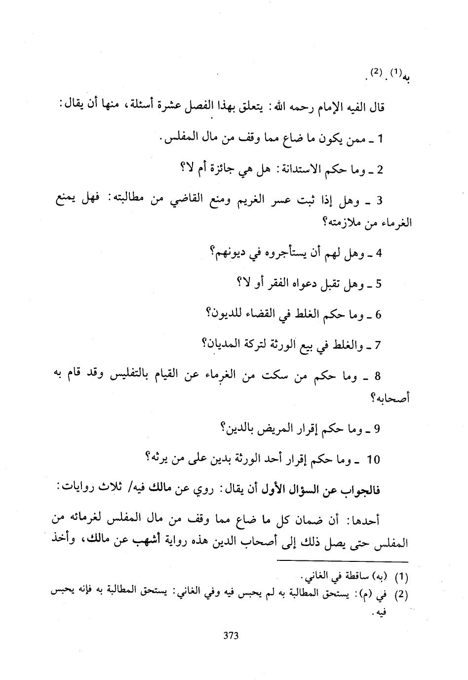 قال الفقيه الإِمام رحمه الله: يتعلق بهذا الفصل عشرة أسئلة، منها أن يقال: