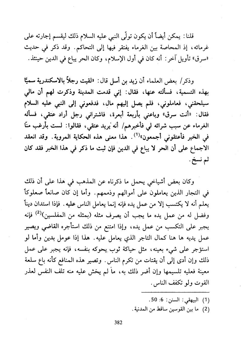 وذكر بعض العلماء أن زيد بن أسل قال: "لقيت رجلًا بالاسكندرية سميَّا بهذه التسمية، فسألته عنها، فقال: إني قدمت المدينة وذكرت لهم أن مالي سيلحقني، فعاملوني، فلم يصل إليهم مال، فدفعوني إلى النبي عليه السلام فقال: "أنت سرق" وباعني بأربعة أبعرة، فاشتراني رجل أراد عتقا، فسأله الغرماء عن سبب شرائه لي فأخبرهم أنه يريد عتقي، فقالوا: لست بأرغب منّا في الخير فأعتقوني أجمعون" (¬1). هذا معنى هذه الحكاية المروية. وقد انعقد الإجماع على أن الحر لا يباع في الدين فإن ثبت ما ذكر في هذا الخبر فقد كان ثم نسخ.