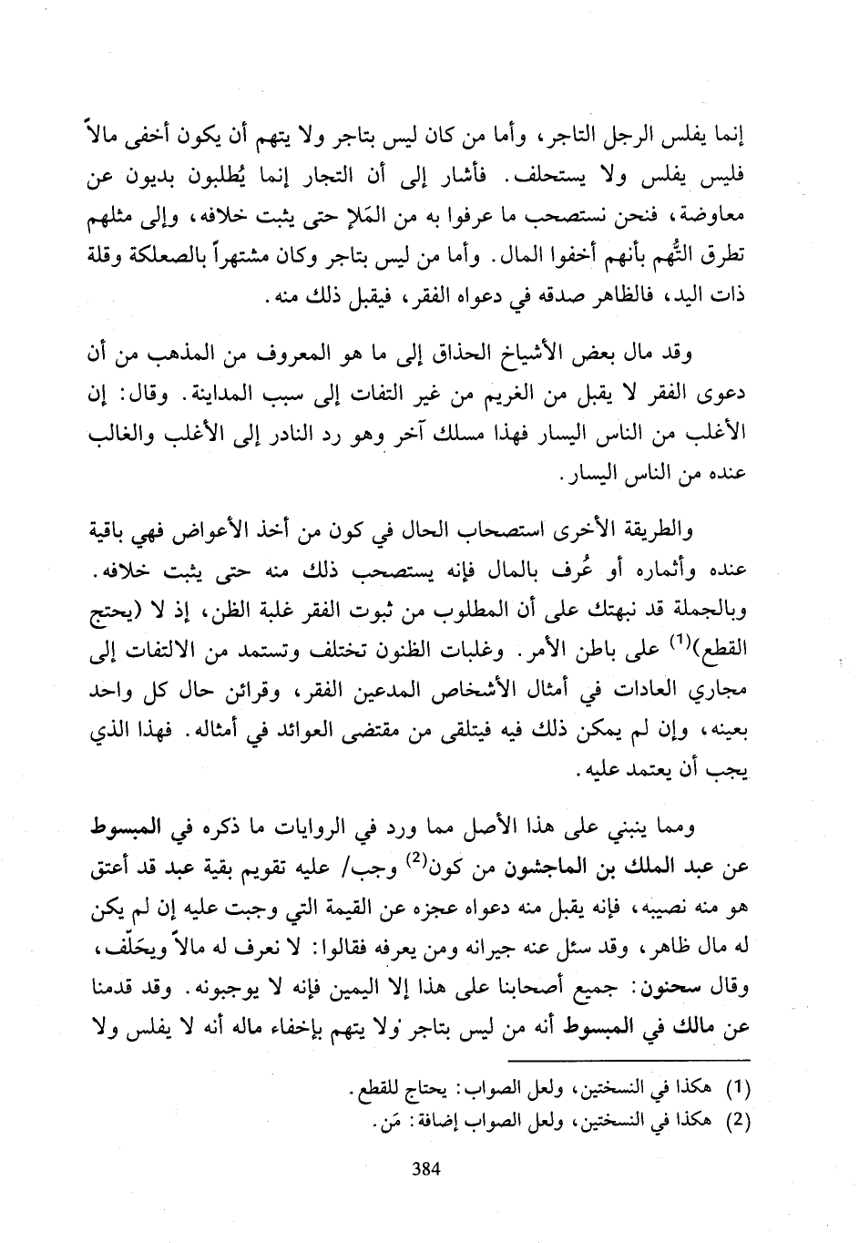 إنما يفلس الرجل التاجر، وأما من كان ليس بتاجر ولا يتهم أن يكون أخفى مالًا فليس يفلس ولا يستحلف. فأشار إلى أن التجار إنما يُطلبون بديون عن معاوضة، فنحن نستصحب ما عرفوا به من المَلإ حتى يثبت خلافه، وإلى مثلهم تطرق التُّهم بأنهم أخفوا المال. وأما من ليس بتاجر وكان مشتهرًا بالصعلكة وقلة ذات اليد، فالظاهر صدقه في دعواه الفقر، فيقبل ذلك منه.
