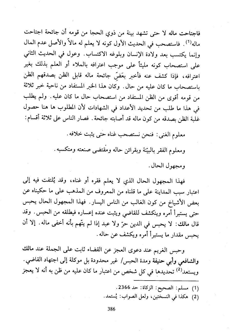 فاجتاحت ماله لا حتى تشهد بينة من ذوي الحجا من قومه أن جائحة اجتاحت ماله (¬1). فاستصحب في الحديث الأول كونه لا يعلم له مالأوالأصل عدم المال وإنما يكتسب بعد ولادة الإنسان وبلوغه الاكتساب. وعول في الحديث الثاني على استصحاب كونه مليئًا على موجب اعترافه بالملاء أو العلم بذلك بغير اعترافه، فإذا كشف عنه فأخبر بعَضِّ جائحة ماله قابل الظن بصدقهم الظن باستصحاب ما كان عليه من حال. وكان هذا الخبر المستفاد من ناحية خبر ثلاثة من قومه أقوى من الظن المستفاد من استصحاب حال ما كان عليه. ولم يطلب في هذا ما طلب من تحديد الأعداد في الشهادات لأن المطلوب ها هنا حصول غلبة الظن بصدقه من كون ماله قد أصابته جائحة. فصار الناس على ثلاثة أقسام: معلوم الغنى: فنحن نستصحب غناه حتى يثبت خلافه.
