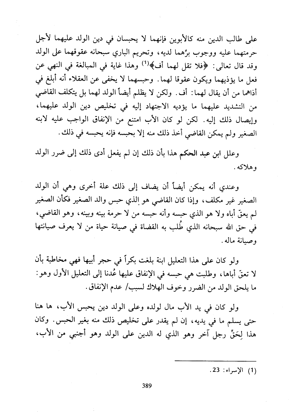 على طالب الدين منه كالأبوين فإنهما لا يحبسان في دين الولد عليهما لأجل حرمتهما عليه ووجوب برهما لديه، وتحريم الباري سبحانه عقوقهما على الولد وقد قال تعالى: {فَلَا تَقُلْ لَهُمَا أُفٍّ} (¬1) وهذا غاية في المبالغة في النهي عن فعل ما يؤذيهما ويكون عقوقا لهما. وحبسهما لا يخفى عن العقلاء أنه أبلغ في أذاهما من أن يقال لهما: أف. ولكن لا يظلم أيضًا الولد لهما بل يتكلف القاضي من التشديد عليهما ما يؤديه الاجتهاد إليه في تخليص دين الولد عليهما، وإيصال ذلك إليه. لكن لو كان الأب امتنع من الإنفاق الواجب عليه لابنه الصغير ولم يمكن القاضي أخذ ذلك منه إلا بحبسه فإنه يحبسه في ذلك.