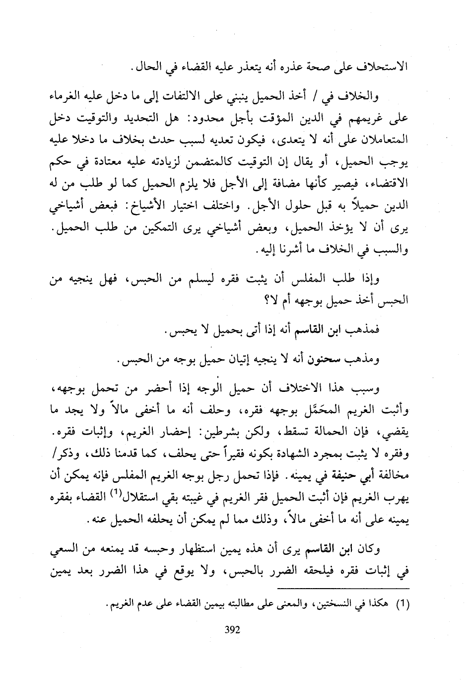 والخلاف في أخذ الحميل ينبني على الالتفات إلى ما دخل عليه الغرماء على غريمهم في الدين المؤقت بأجل محدود: هل التحديد والتوقيت دخل المتعاملان على أنه لا يتعدى، فيكون تعديه لسبب حدث بخلاف ما دخلا عليه يوجب الحميل، أو يقال إن التوقيت كالمتضمن لزيادته عليه معتادة في حكم الاقتضاء، فيصير كأنها مضافة إلى الأجل فلا يلزم الحميل كما لو طلب من له الدين حميلًا به قبل حلول الأجل. واختلف اختيار الأشياخ: فبعض أشياخي يرى أن لا يؤخذ الحميل، وبعض أشياخي يرى التمكين من طلب الحميل.