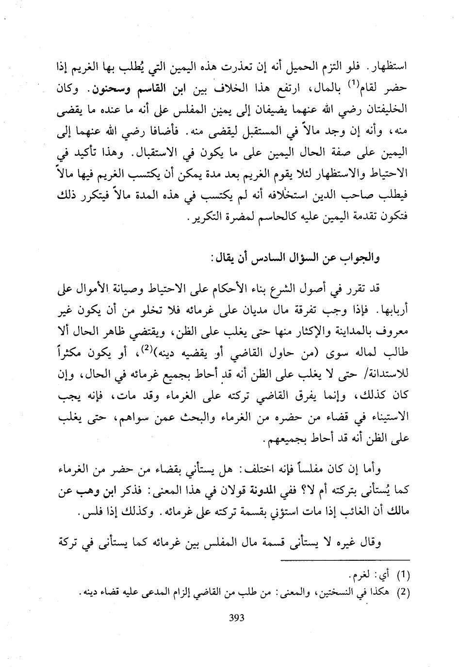 استظهار. فلو التزم الحميل أنه إن تعذرت هذه اليمين التي يُطلب بها الغريم إذا حضر لقام (¬1) بالمال، ارتفع هذا الخلاف بين ابن القاسم وسحنون. وكان الخليفتان رضي الله عنهما يضيفان إلى يمين المفلس على أنه ما عنده ما يقضى منه، وأنه إن وجد مالًا في المستقبل ليقضى منه. فأضافا رضي الله عنهما إلى اليمين على صفة الحال اليمين على ما يكون في الاستقبال. وهذا تأكيد في الاحتياط والاستظهار لئلا يقوم الغريم بعد مدة يمكن أن يكتسب الغريم فيها مالًا فيطلب صاحب الدين استخلافه أنه لم يكتسب في هذه المدة مالًا فيتكرر ذلك فتكون تقدمة اليمين عليه كالحاسم لمضرة التكرير.