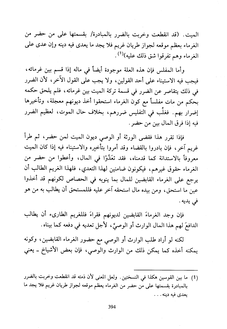 (¬1) ما بين القوسين هكذا في النسختين. ولعل المعنى لأن ذمته قد انقطعت وخربت بالضرر بالمبادرة بقسمتها على من حضر من الغرماء يعظم موقعه لجواز طريان غريم فلا يجد ما يعلى فيه دينه ...