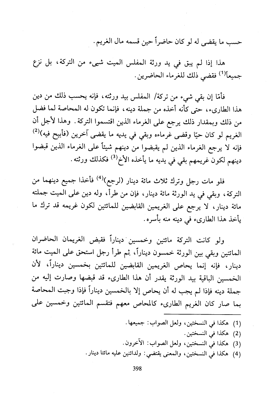 (¬4) هكذا في النسختين، والمعنى يقتضي: ولدائنين عليه مائتا دينار.