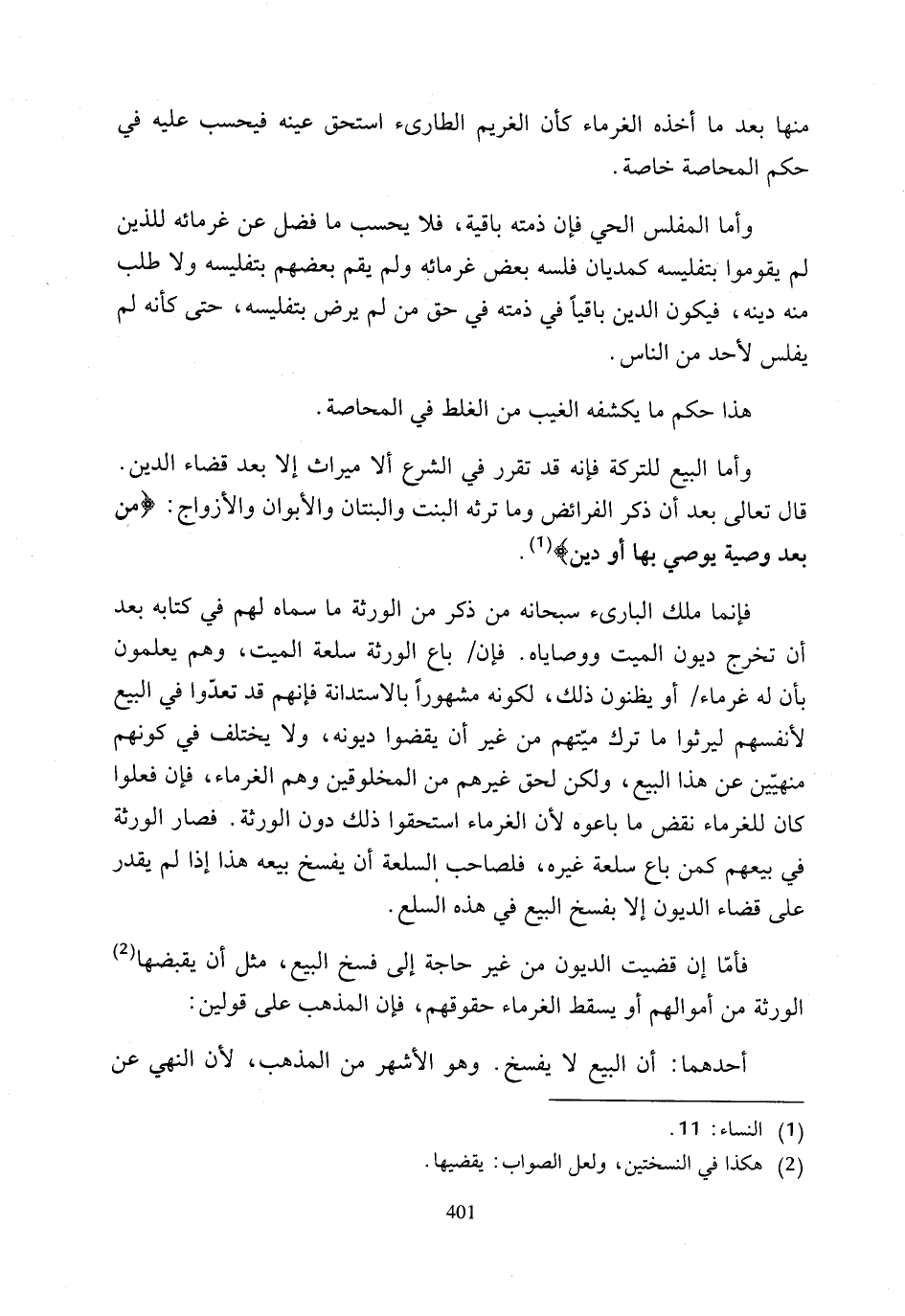 قال تعالى بعد أن ذكر الفرائض وما ترثه البنت والبنتان والأبوان والأزواج: {مِنْ بَعْدِ وَصِيَّةٍ يُوصِي بِهَا أَوْ دَيْنٍ} (¬1). فإنما ملك البارئ سبحانه من ذكر من الورثة ما سماه لهم في كتابه بعد أن تخرج ديون الميت ووصاياه. فإن باع الورثة سلعة الميت، وهم يعلمون بأن له غرماء أو يظنون ذلك، لكونه مشهورًا بالاستدانة فإنهم قد تعدّوا في البيع لأنفسهم ليرثوا ما ترك ميّتهم من غير أن يقضوا ديونه، ولا يختلف في كونهم منهيّين عن هذا البيع، ولكن لحق غيرهم من المخلوقين وهم الغرماء، فإن فعلوا كان للغرماء نقض ما باعوه لأن الغرماء استحقوا ذلك دون الورثة. فصار الورثة في بيعهم كمن باع سلعة غيره، فلصاحب السلعة أن يفسخ بيعه هذا إذا لم يقدر على قضاء الديون إلا بفسخ البيع في هذه السلع.