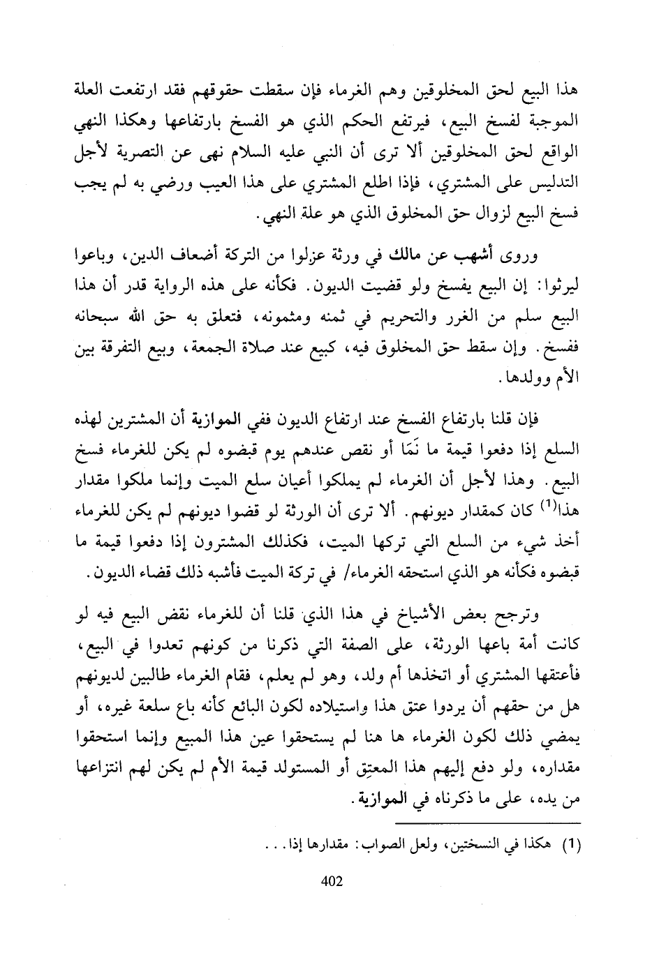 وروى أشهب عن مالك في ورثة عزلوا من التركة أضعاف الدين، وباعوا ليرثوا: إن البيع يفسخ ولو قضيت الديون. فكأنه على هذه الرواية قدر أن هذا البيع سلم من الغرر والتحريم في ثمنه ومثمونه، فتعلق به حق الله سبحانه ففسخ. وإن سقط حق المخلوق فيه، كبيع عند صلاة الجمعة، وبيع التفرقة بين الأم وولدها.