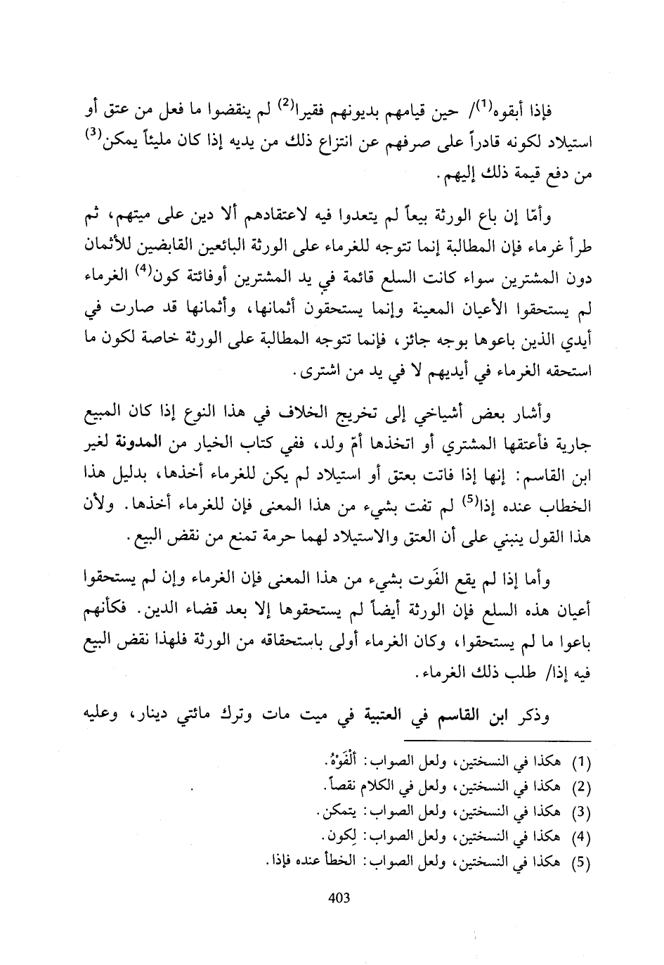 وأمّا إن باع الورثة بيعًا لم يتعدوا فيه لاعتقادهم ألا دين على ميتهم، ثم طرأ غرماء فإن المطالبة إنما تتوجه للغرماء على الورثة البائعين القابضين للأثمان دون المشترين سواء كانت السلع قائمة في يد المشترين أوفائتة كون (¬4) الغرماء لم يستحقوا الأعيان المعينة وإنما يستحقون أثمانها، وأثمانها قد صارت في أيدي الذين باعوها بوجه جائز، فإنما تتوجه المطالبة على الورثة خاصة لكون ما استحقه الغرماء في أيديهم لا في يد من اشترى.