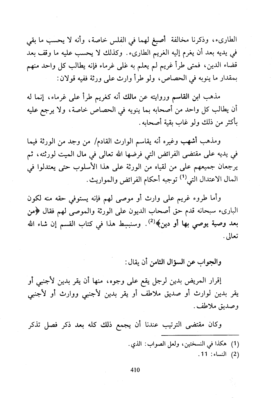 وأما طروء غريم على وارث أو موسى لهم فإنه يستوفي حقه منه لكون البارئ سبحانه قدم حق أصحاب الديون عني الورثة والموصى لهم فقال {مِنْ بَعْدِ وَصِيَّةٍ يُوصِي بِهَا أَوْ دَيْنٍ} (¬2). وسنبسط هذا في كتاب القسم إن شاء الله تعالى.