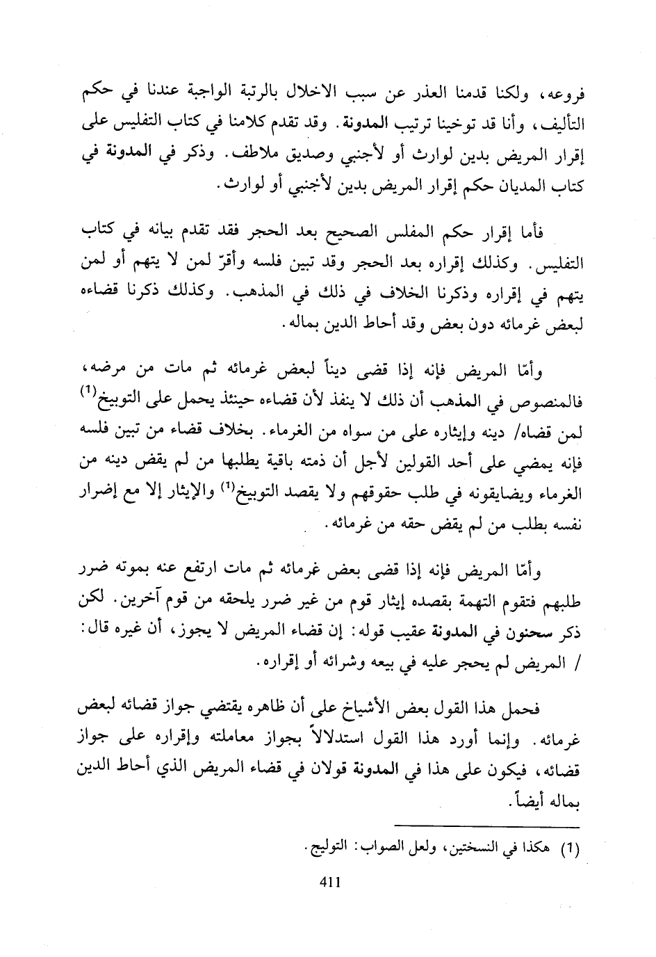 فروعه، ولكنا قدمنا العذر عن سبب الاخلال بالرتبة الواجبة عندنا في حكم التأليف، وأنا قد توخينا ترتيب المدونة. وقد تقدم كلامنا في كتاب التفليس على إقرار المريض بدين لوارث أو لأجنبي وصديق ملاطف. وذكر في المدونة في كتاب المديان حكم إقرار المريض بدين لأجنبي أو لوارث.
