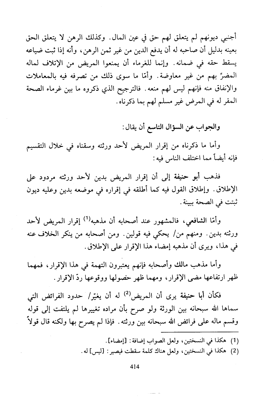 وأفا الشافعي، فالمشهور عند أصحابه أن مذهبه (¬1) إقرار المريض لأحد ورثته بدين. ومنهم من يحكي فيه قولين. ومن أصحابه من ينكر الخلاف عنه في هذا، ويرى أن مذهبه إمضاء هذا الإقرار على الإطلاق.