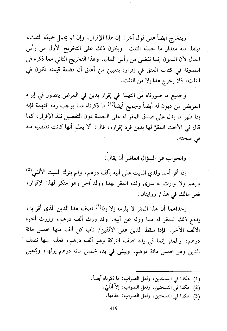 ويتخرج أيضًا على قول آخر: إن هذا الإقرار، وإن لم يحمل جميعَه الثلث، فينفذ منه مقدار ما حمله الثلث. ويكون ذلك على التخريج الأول من رأس المال لأن الديون إنما تقضى من رأس المال. وهذا التخريج الثاني مما ذكره في المدونة في كتاب العتق في إقراره بتعيين من أعتق أن فضلة قيمته تكون في الثلث، فلا يخرج هذا إلا من الثلث.