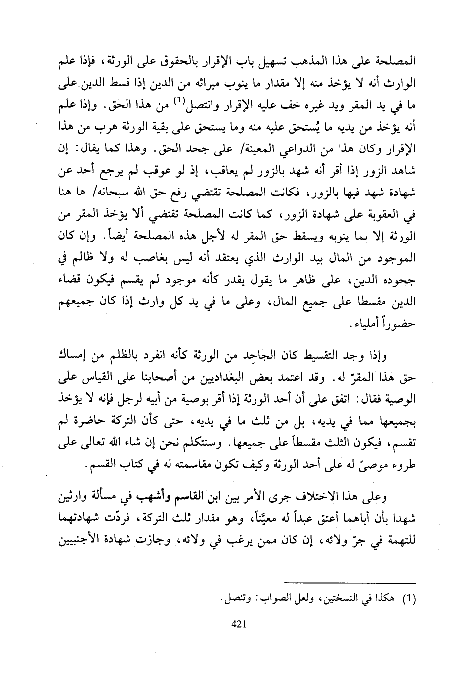المصلحة على هذا المذهب تسهيل باب الإقرار بالحقوق على الورثة، فإذا علم الوارث أنه لا يؤخذ منه إلا مقدار ما ينوب ميراثه من الدين إذا قسط الدين على ما في يد المقر ويد غيره خف عليه الإقرار وانتصل (¬1) من هذا الحق. وإذا علم أنه يؤخذ من يديه ما يُستحق عليه منه وما يستحق على بقية الورثة هرب من هذا الإقرار وكان هذا من الدواعي المعينة على جحد الحق. وهذا كما يقال: إن شاهد الزور إذا أقر أنه شهد بالزور لم يعاقب، إذ لو عوقب لم يرجع أحد عن شهادة شهد فيها بالزور، فكانت المصلحة تقتضي رفع حق الله سبحانه ها هنا في العقوبة على شهادة الزور، كما كانت المصلحة تقتضي ألا يؤخذ المقر من الورثة إلا بما ينوبه ويسقط حق المقر له لأجل هذه المصلحة أيضًا. وإن كان الموجود من المال بيد الوارث الذي يعتقد أنه ليس بغاصب له ولا ظالم في جحوده الدين، على ظاهر ما يقول يقدر كأنه موجود لم يقسم فيكون قضاء الدين مقسطا على جميع المال، وعلى ما في يد كل وارث إذا كان جميعهم حضورًا أملياء.