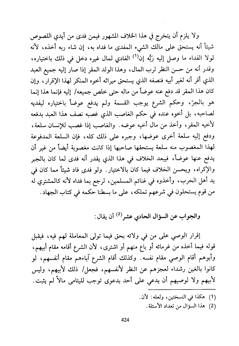 ولا يلزم أن يتخرج في هذا الخلاف المشهور فيمن فدى من أيدي اللصوص شيئًا أنه يستحق على مالك الشيء المفدى ما فداه به، إن شاء ربه أخذه، لأنه لولا الفداء ما وصل إليه رَبُّه إن (¬1) الفادي لمال غيره دخل في ذلك باختياره، وقدر أنه من حسن النظر لرب المال، وهذا الولد المقر إذا صار إليه جميع العبد الذي أقر أنه لغير أبيه فنصفه الذي يستحق ميراثه أخوه المنكر لهذا الإقرار، وإن كان هذا المقر قد دفع عنه عوضًا من ماله حتى خلص جميعه إليه فإنما هذا إنما هو بالجرّ، وحكم الشرع يوجب القسمة ولم يدفع عوضًا باختياره ليفديه لصاحبه، بل أخوه عنده في حكم الغاصب الذي غصبه نصف هذا العبد بدفعه لأخيه المقر، وأخذ من مال أخيه عوضه. والغاصب إذا غصب للإنسان سلعة، ودفع إليه سلعة أخرى عوضها، وجبره على ذلك كله، فإن السلعة المدفوعة لهذا المغصوب منه سلعة يستحقها صاحبها إذا كانت مغصوبة أيضًا من غير أن يدفع عنها عوضًا، فيبعد الخلاف في هذا الذي يقدر أنه فدى لما كان بالجبر والإكراه، ويحسن الخلاف فيما كان بالاختيار. ولو فدى فاد شيئًا مما كان في يد أهل الحرب، وأخذوه في غنائم المسلمين، لرجع بما فداه لأنه كالمشتري له من قوم يستحلون في شرعهم تملكه، على ما بسطنا حكمه في كتاب الجهاد.