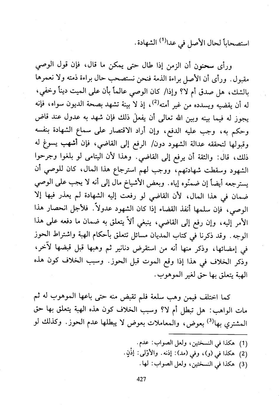ورأى سحنون أن الزمن إذا طال حتى يمكن ما قال، فإن قول الوصي مقبول. ورأى أن الأصل براءة الذمة فنحن نستصحب حال براءة ذمته ولا نعمرها بالشك، هل صدق أم لا؟ وإذا كان الوصي عالمًا بان على الميت دينًا وخفي، له أن يقضيه ويسدده من غير أمته (¬2)، إذ لا بينة تشهد بصحة الديون سواه، فإنه يجوز له فيما بينه وبين الله تعالى أن يفعل ذلك فإن شهد به عدول عند قاض وحكم به، وجب عليه الدفع، وإن أراد الاقتصار على سماع الشهادة بنفسه وقبولها لتحققه عدالة الشهود دون الرفع إلى القاضي، فإن أشهب يسوغ له ذلك، قال: والثقة أن يرفع إلى القاضي. وهذا لأن اليتامى لو بلغوا وجرحوا الشهود وسقطت شهادتهم، ووجب لهم استرجاع هذا المال، كان للوصي أن يسترجعه أيضًا إن ضمنّوه إياه. وبعض الأشياخ مال إلى أنه لا يجب على الوصي ضمان في هذا المال؛ لأن القاضي لو رفعت إليه الشهادة لم يعذر فيها إلا الوصي، فإن سلمها أنفذ القضاء إذا كان الشهود عدولًا. فلأجل انحصار هذا الأمر إليه، وإن رفع إلى القاضي، ينبغي ألاّ يتعلق به ضمان ما دفعه على هذا الوجه. وقد ذكرنا في كتاب المديان مسائل تتعلق بأحكام الهبة واشتراط الحوز في إمضائها، وذكر منها أنه من استقرض دنانير ثم وهبها قبل قبضها لآخر، وذكر الخلاف في هذا إذا وقع الموت قبل الحوز. وسبب الخلاف كون هذه الهبة يتعلق بها حق لغير الموهوب.
