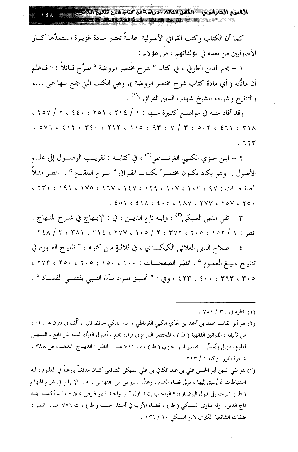 1 - نجم الدين الطوفي، في كتابه " شرح مختصر الروضة " صرَّح قائلاً: ((فاعلم أن مادَّته (أي مادة كتاب شرح مختصر الروضة) ، وهي الكتب التي جمع منها هي. . .، والتنقيح وشرحه للشيخ شهاب الدين القرافي)) (¬1) .