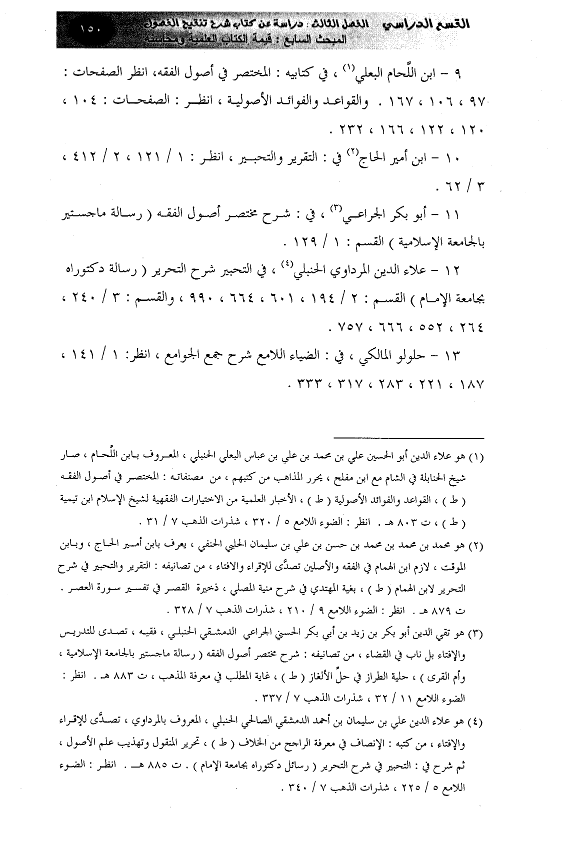 12 - علاء الدين المرداوي الحنبلي (¬4) ، في التحبير شرح التحرير (رسالة دكتوراه بجامعة الإمام) القسم: 2 / 194، 601، 664، 990، والقسم: 3 / 240، 264، 552، 666، 757.