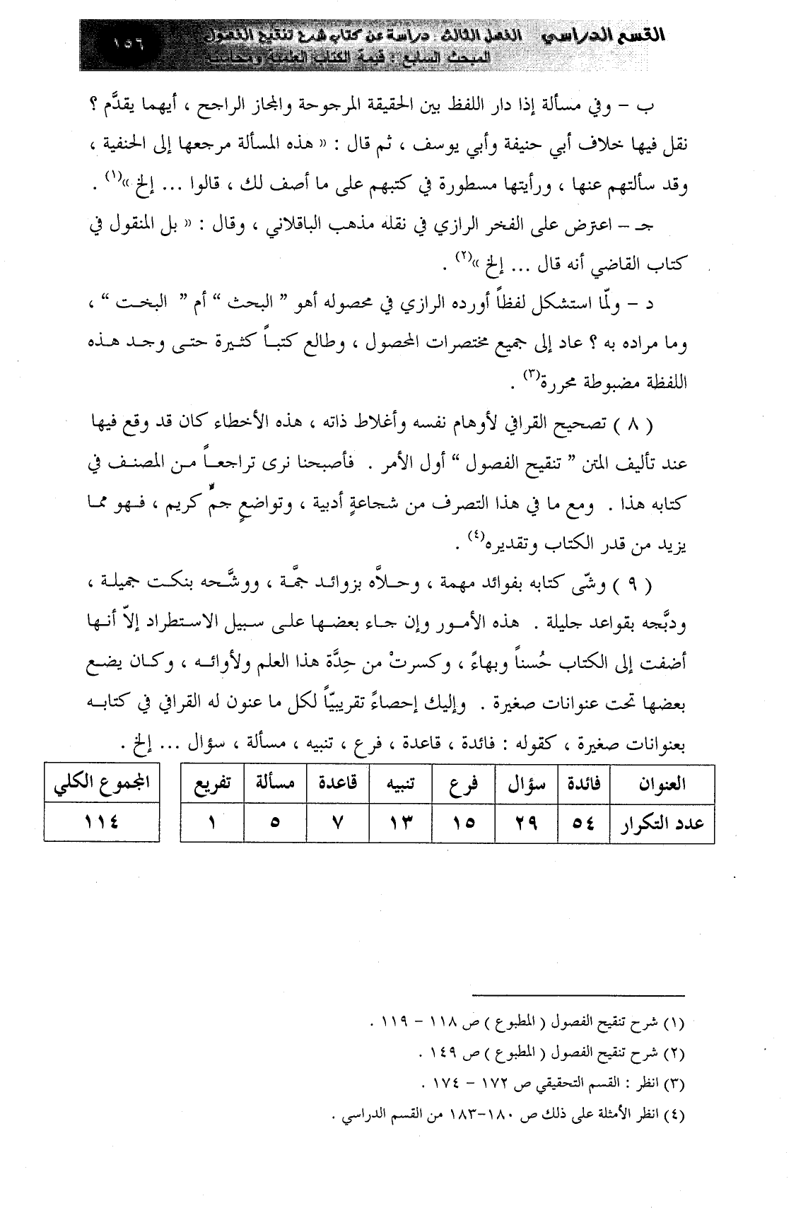 (9) وشّى كتابه بفوائد مهمة، وحلاَّه بزوائد جمَّة، ووشَّحه بنكت جميلة، ودبَّجه بقواعد جليلة. هذه الأمور وإن جاء بعضها على سبيل الاستطراد إلاّ أنها أضفت إلى الكتاب حُسناً وبهاءً، وكسرتْ من حِدَّة هذا العلم ولأوائه، وكان يضع بعضها تحت عنوانات صغيرة. وإليك إحصاءً تقريبيّاً لكل ما عنون له القرافي في كتابه بعنوانات صغيرة، كقوله: فائدة، قاعدة، فرع، تنبيه، مسألة، سؤال. . . إلخ.
