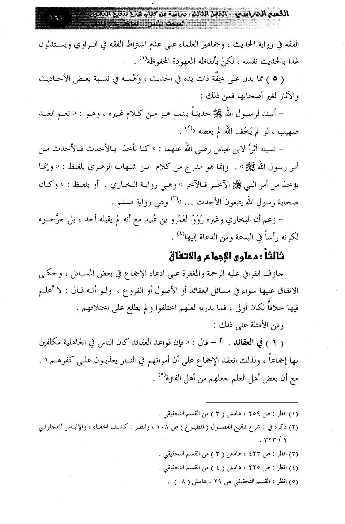 جازف القرافي عليه الرحمة والمغفرة على ادعاء الإجماع في بعض المسائل، وحكى الاتفاق عليها سواء في مسائل العقائد أو الأصول أو الفروع، ولو أنه قال: لا أعلم فيها خلافاً لكان أولى، فما يدريه لعلهم اختلفوا ولم يطلع على اختلافهم.