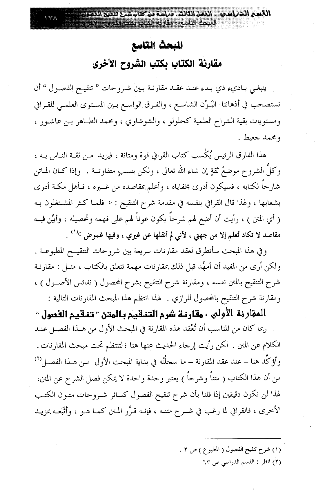 وفي هذا المبحث سأتطرق لعقد مقارنات سريعة بين شروحات التنقيح المطبوعة. ولكن أرى من المفيد أن أمهِّد قبل ذلك بمقارنات مهمة تتعلق بالكتاب، مثل: مقارنة شرح التنقيح بالمتن نفسه، ومقارنة شرح التنقيح بشرح المحصول (نفائس الأصول) ، ومقارنة شرح التنقيح بالمحصول للرازي. لهذا انتظم هذا المبحث المقارنات التالية: