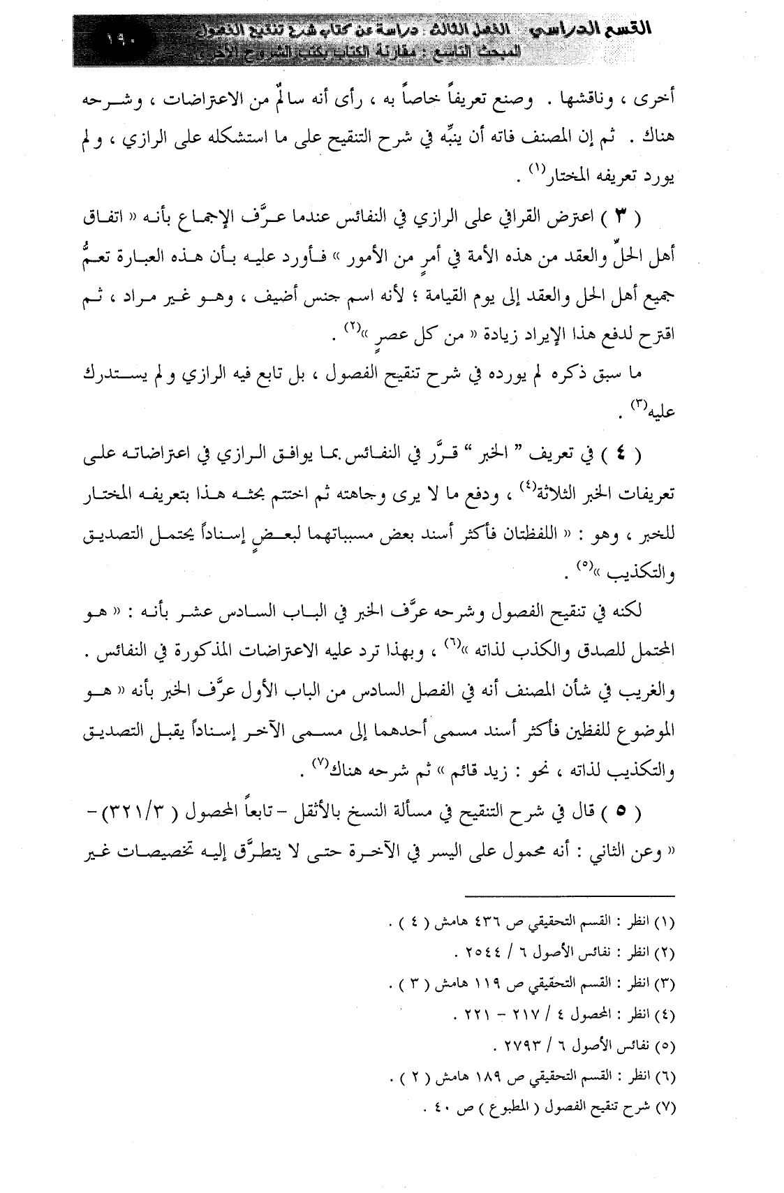 ما سبق ذكره لم يورده في شرح تنقيح الفصول، بل تابع فيه الرازي ولم يستدرك عليه (¬3) .