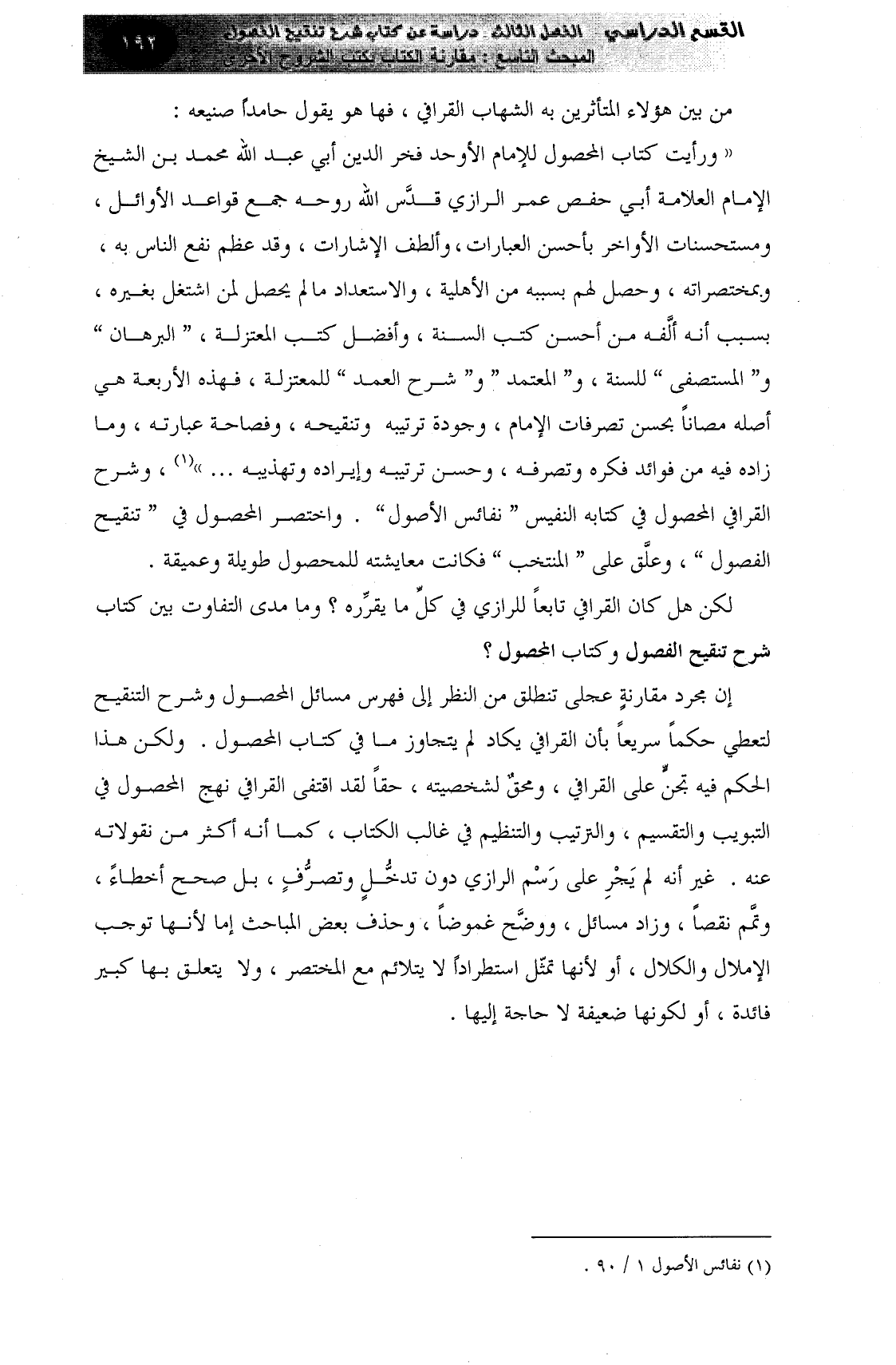لكن هل كان القرافي تابعاً للرازي في كلِّ ما يقرِّره؟ وما مدى التفاوت بين كتاب شرح تنقيح الفصول وكتاب المحصول؟