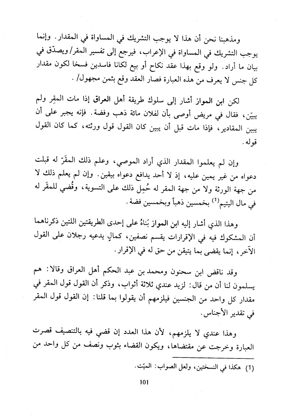 لكن ابن المواز أشار إلى سلوك طريقة أهل العراق إذا مات المقِر ولم يبيّن، فقال في مريض أوصى بأن لفلان مائة ذهب وفضة. فإنه يجبر على أن يبين المقادير، فإذا مات قبل أن يبين كان القول قول ورثته، كما كان القول قوله.
