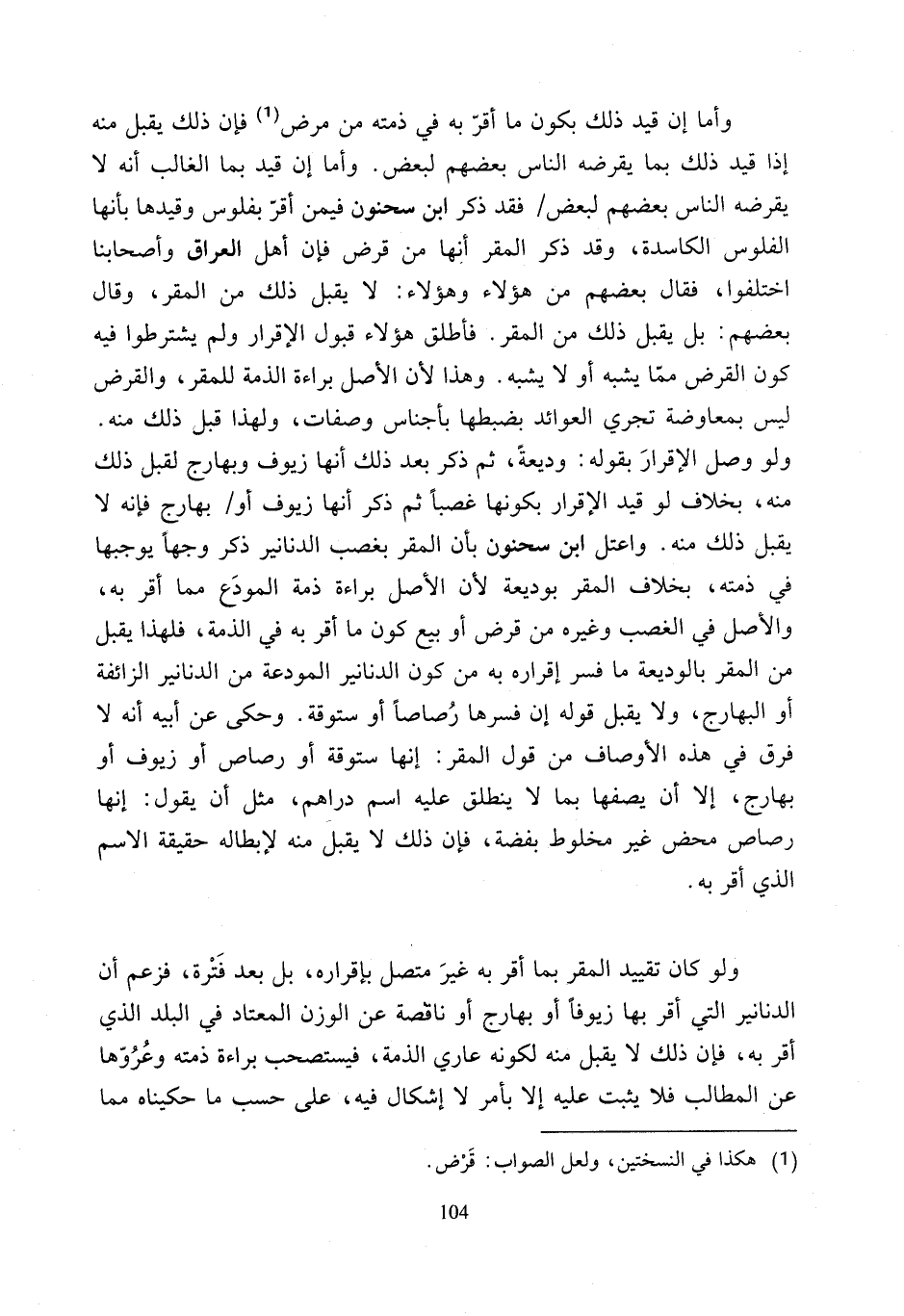 وأما إن قيد ذلك يكون ما أقرّ به في ذمته من مرض (¬1) فإن ذلك يقبل منه إذا قيد ذلك بما يقرضه الناس بعضهم لبعض. وأما إن قيد بما الغالب أنه لا يقرضه الناس بعضهم لبعض فقد ذكر ابن سحنون فيمن أقرّ بفلوس وقيدها بأنها الفلوس الكاسدة، وقد ذكر المقر أنجها من قرض فإن أهل العراق وأصحابنا اختلفوا، فقال بعضهم من هؤلاء وهؤلاء: لا يقبل ذلك من المقر، وقال بعضهم: بل يقبل ذلك من المقر. فأطلق هؤلاء قبول الإقرار ولم يشترطوا فيه كون القرض مِمّا يشبه أو لا يشبه. وهذا لأن الأصل براءة الذمة للمقر، والقرض ليس بمعاوضة تجري العوائد بضبطها بأجناس وصفات، ولهذا قبل ذلك منه.