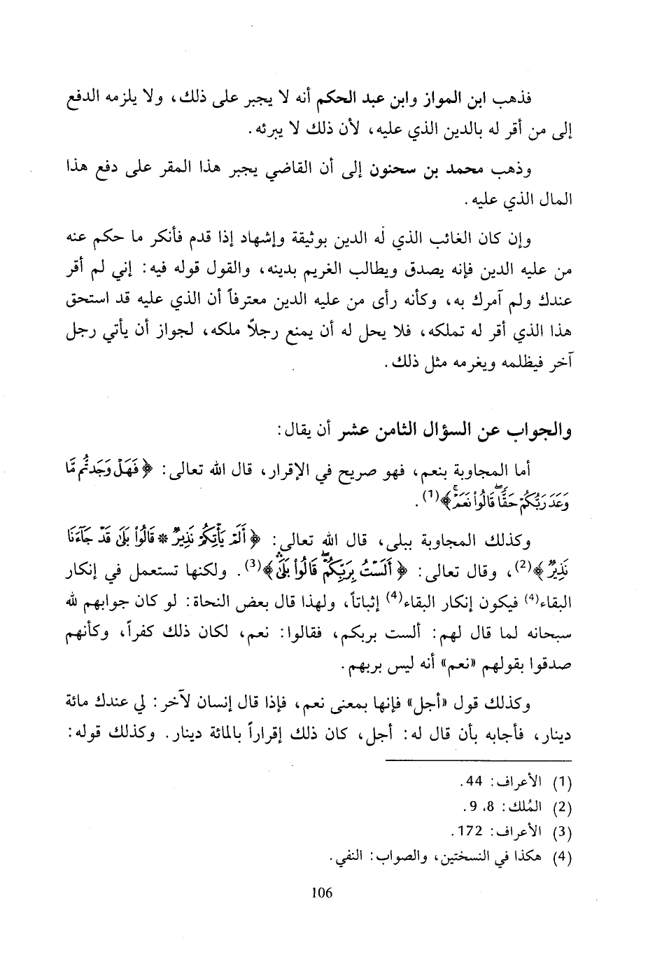 أما المجاوبة بنعم، فهو صريح في الإقرار، قال الله تعالى: {فَهَلْ وَجَدْتُمْ مَا وَعَدَ رَبُّكُمْ حَقًّا قَالُوا نَعَمْ} (¬1). وكذلك المجاوبة ببلى، قال الله تعالبى. {أَلَمْ يَأْتِكُمْ نَذِيرٌ (8) قَالُوا بَلَى قَدْ جَاءَنَا نَذِيرٌ} (¬2)، وقال تعالى: {أَلَسْتُ بِرَبِّكُمْ قَالُوا بَلَى} (¬3). ولكنها تستعمل في إنكار البقاء (¬4) فيكون إنكار البقاء (4) إثباتًا، ولهذا قال بعض النحاة: لو كان جوابهم لله سبحانه لما قال لهم: ألست بربكم، فقالوا: نعم، لكان ذلك كفرًا، وكأنهم صدقوا بقولهم "نعم" أنه ليس بربهم.