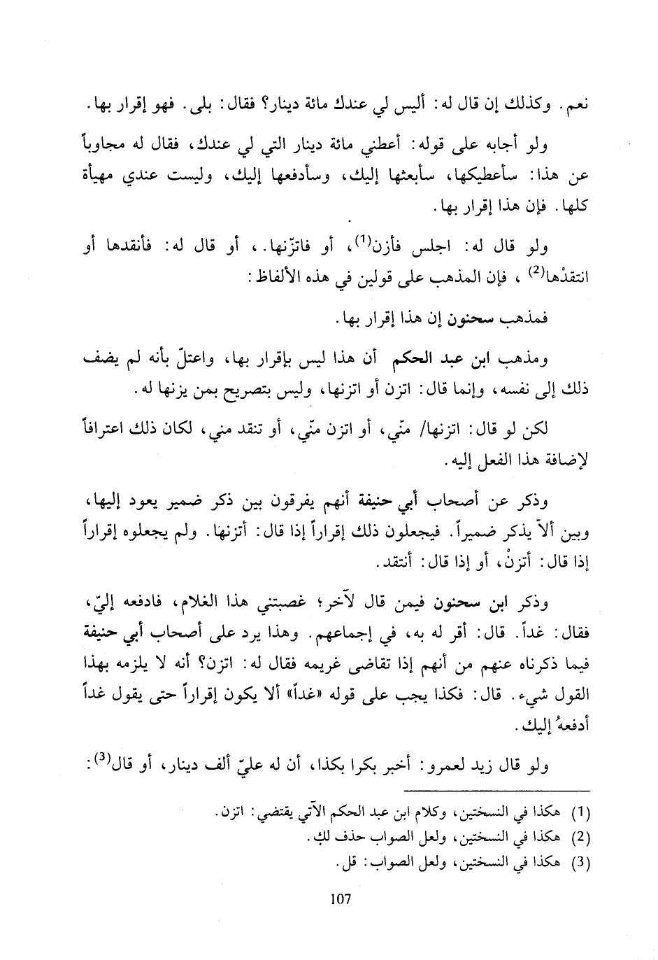 وذكر عن أصحاب أبي حنيفة أنهم يفرقون بين ذكر ضمير يعود إليها، وبين ألاّ يذكر ضميرًا. فيجعلون ذلك إقرارًا إذا قال: أتزنها. ولم يجعلوه إقرارًا إذا قال: أتزن، أو إذا قال: أنتقد.