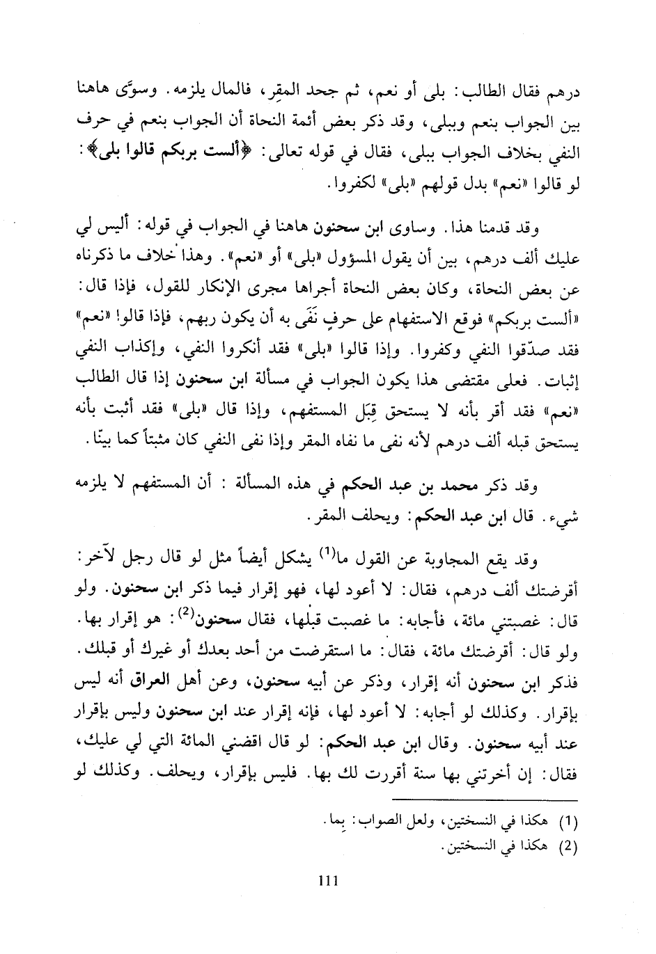 "ألست بربكم" فوقع الاستفهام على حرفٍ نَفَى به أن يكون ربهم؛ فإذا قالوا "نعم" فقد صدّقوا النفي وكفروا. وإذا قالوا "بلى" فقد أنكروا النفي، وإكذاب النفي إثبات. فعلى مقتضى هذا يكون الجواب في مسألة ابن سحنون إذا قال الطالب "نعم" فقد أقر بأنه لا يستحق قِبَل المستفهم، وإذا قال "بلى" فقد أثبت بأنه يستحق قبله ألف درهم لأنه نفى ما نفاه المقر وإذا نفى النفي كان مثبتًا كما بينّا.