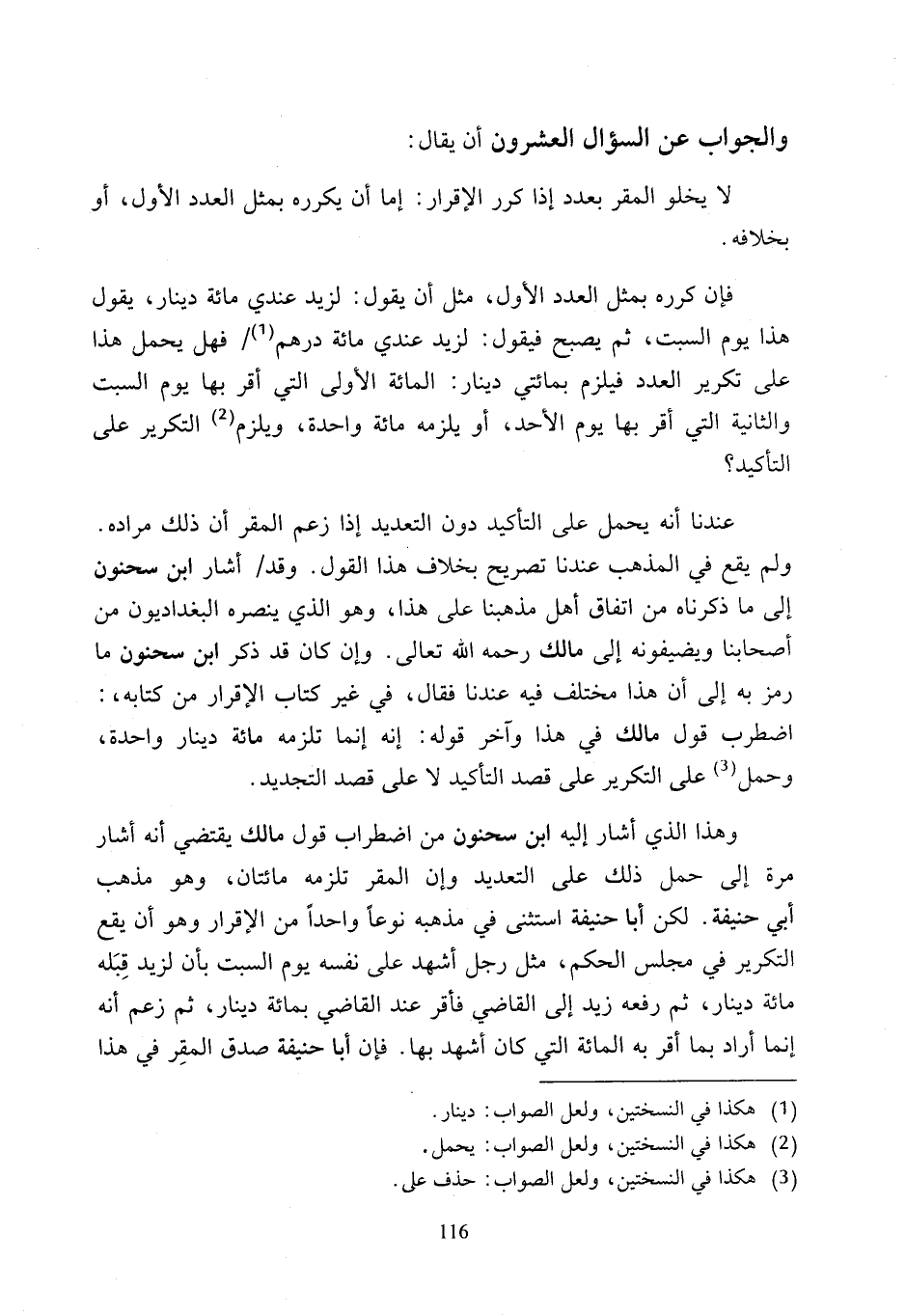 وهذا الذي أشار إليه ابن سحنون من اضطراب قول مالك يقتضي أنه أشار مرة إلى حمل ذلك على التعديد وإن المقر تلزمه مائتان، وهو مذهب أبي حنيفة. لكن أبا حنيفة استثنى في مذهبه نوعأواحدًا من الإقرار وهو أن يقع التكرير في مجلس الحكم، مثل رجل أشهد على نفسه يوم السبت بأن لزيد قِبَله مائة دينار، ثم رفعه زيد إلى القاضي فأقر عند القاضي بمائة دينار، ثم زعم أنه إنما أراد بما أقر به المائة التي كان أشهد بها. فإن أبا حنيفة صدق المقِر في هذا