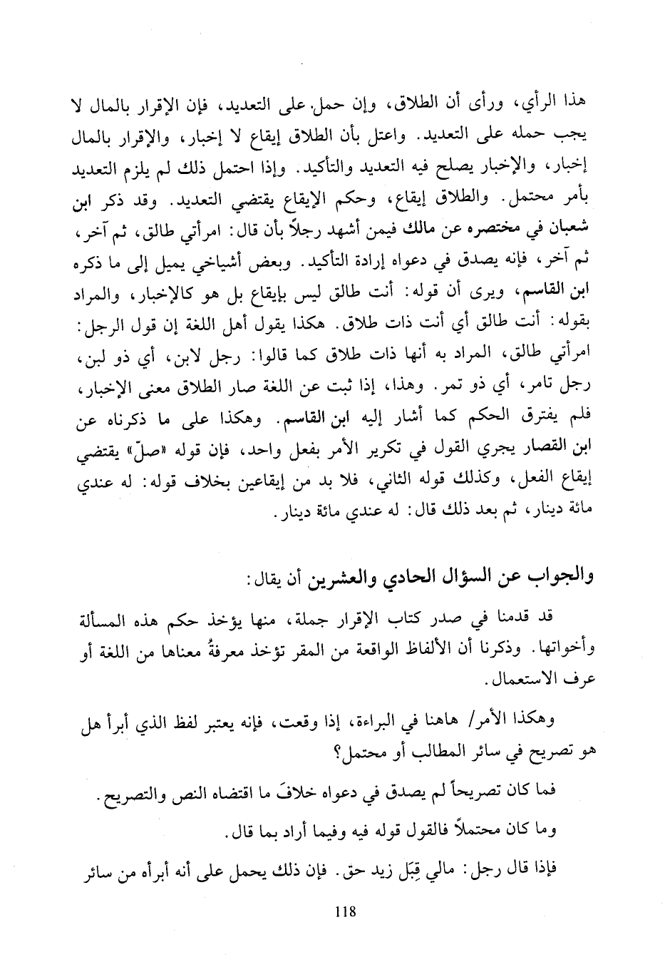 هذا الرأي، ورأى أن الطلاق، وإن حمل. على التعديد، فإن الإقرار بالمال لا يجب حمله على التعديد. واعتل بأن الطلاق إيقاع لا إخبار، والإقرار بالمال إخبار، والإخبار يصلح فيه التعديد والتأكيد. وإذا احتمل ذلك لم يلزم التعديد بأمر محتمل. والطلاق إيقاع، وحكم الإيقاع يقتضي التعديد. وقد ذكر ابن شعبان في مختصره عن مالك فيمن أشهد رجلًا بأن قال: امرأتي طالق، ثم آخر، ثم آخر، فإنه يصدق في دعواه إرادة التأكيد. وبعض أشياخي يميل إلى ما ذكره ابن القاسم، ويرى أن قوله: أنت طالق ليس بإيقاع بل هو كالإخبار، والمراد بقوله: أنت طالق أي أنت ذات طلاق. هكذا يقول أهل اللغة إن قول الرجل: امرأتي طالق، المراد به أنها ذات طلاق كما قالوا: رجل لابن، أي ذو لبن، رجل تأمر، أي ذو تمر. وهذا، إذا ثبت عن اللغة صار الطلاق معنى الإخبار، فلم يفترق الحكم كما أشار إليه ابن القاسم. وهكذا على ما ذكرناه عن ابن القصار يجري القول في تكرير الأمر بفعل واحد، فإن قوله "صلّ" يقتضي إيقاع الفعل، وكذلك قوله الثاني، فلا بد من إيقاعين بخلاف قوله: له عندي مائة دينار، ثم بعد ذلك قال: له عندي مائه دينار.