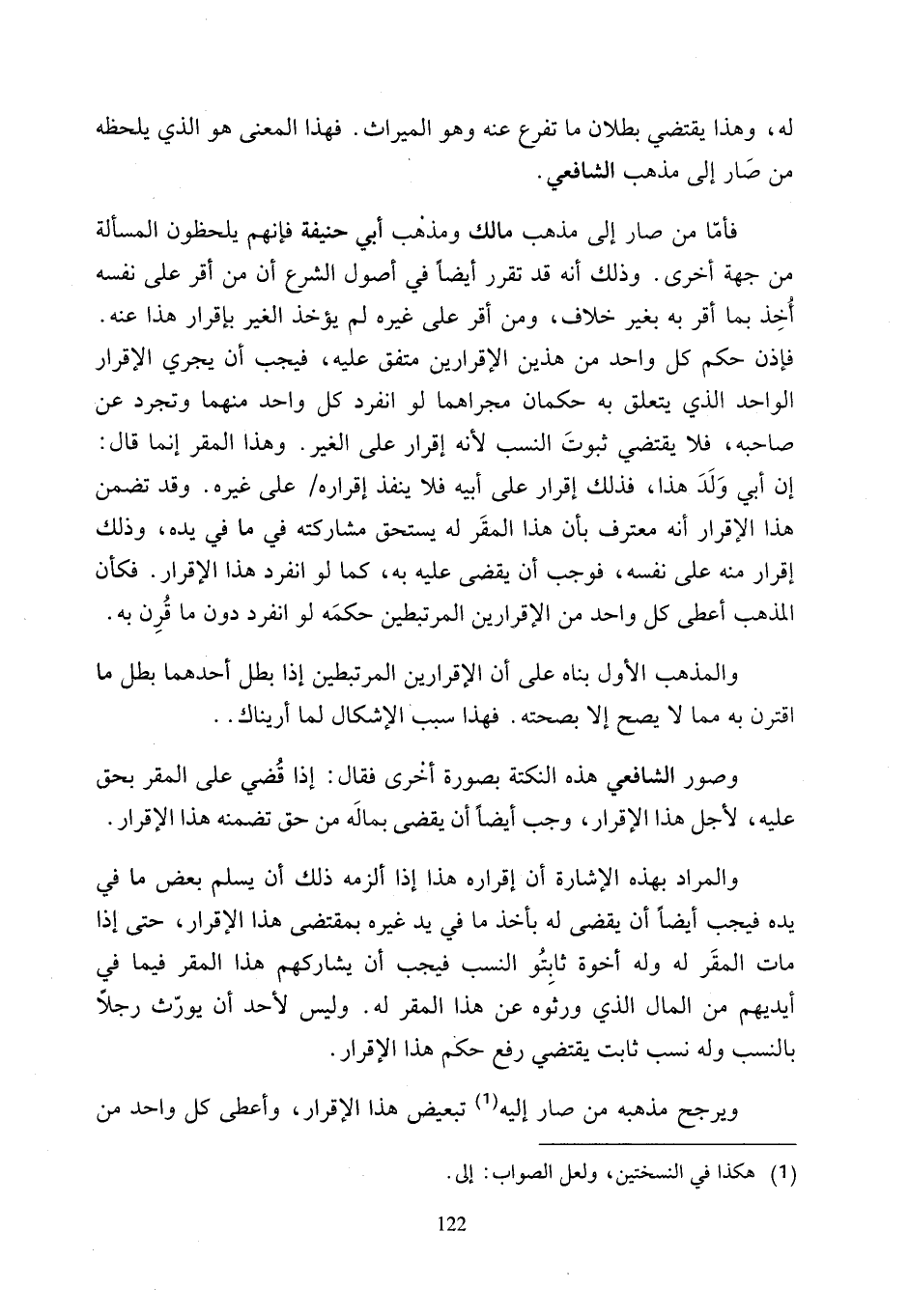 والمراد بهذه الإشارة أن إقراره هذا إذا ألزمه ذلك أن يسلم يعض ما في يده فيجب أيضًا أن يقضى له بأخذ ما في يد غيره بمقتضى هذا الإقرار، حتى إذا مات المقَر له وله أخوة ثابِتُو النسب فيجب أن يشاركهم هذا المقر فيما في أيديهم من المال الذي ورثوه عن هذا المقر له. وليس لأحد أن يورّث رجلًا بالنسب وله نسب ثابت يقتضي رفع حكم هذا الإقرار.