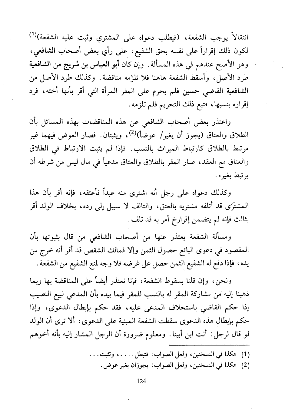 ومسألة الشفعة يعتذر عنها من أصحاب الشافعي من قال بثبوتها بأن المقصود في دعوى البائع حصول الثمن وإلا فمالك الشقص قد أقر أنه خرج من يده، فإذا دفع له الشفيع الثمن حصل على غرضه فلا وجه لمنع الشفيع من الشفعة.