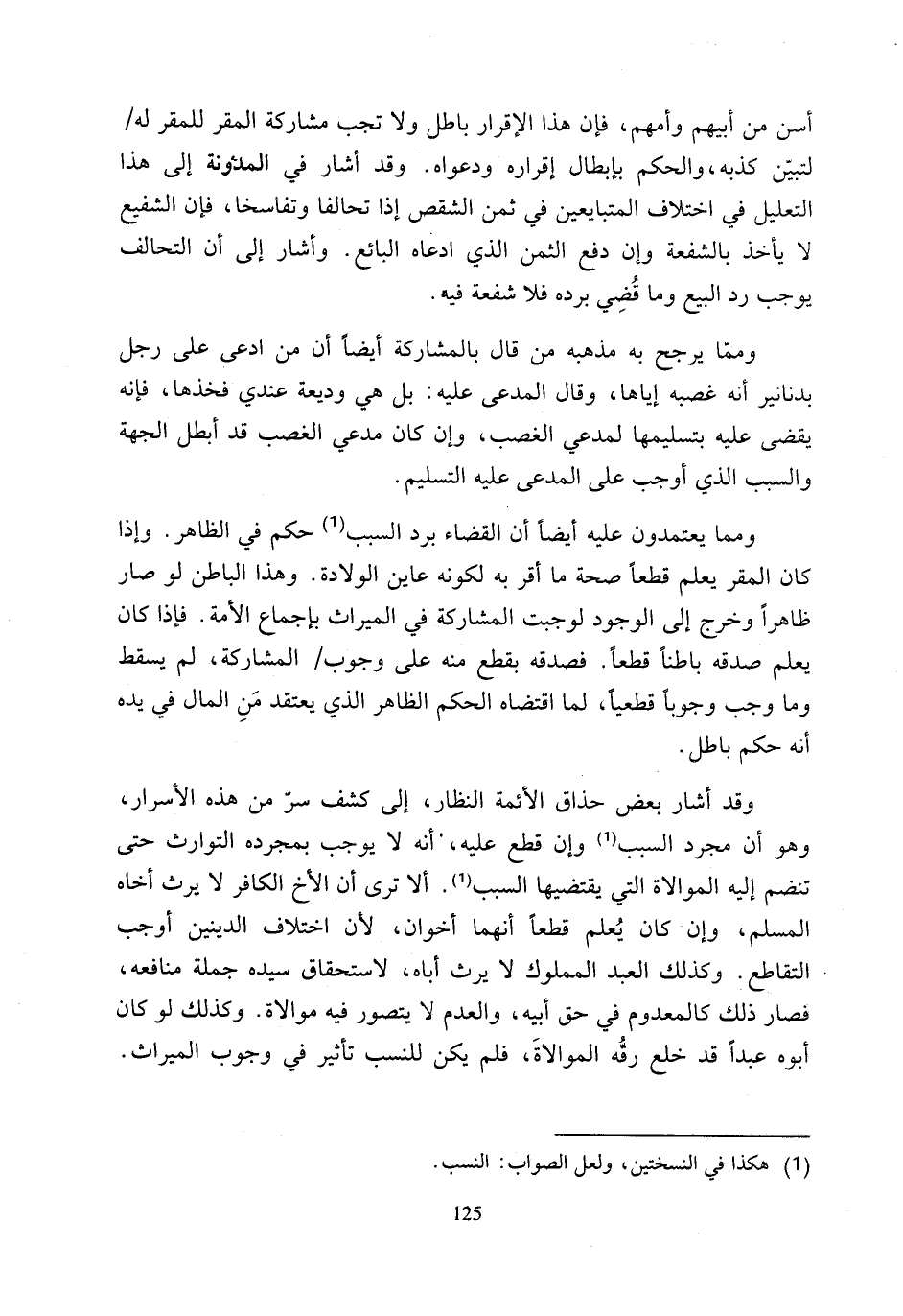وقد أشار بعض حذاق الأئمة النظار، إلى كشف سرّ من هذه الأسرار، وهو أن مجرد السبب (1) وإن قطع عليه، أنه لا يوجب بمجرده التوارث حتى تنضم إليه الموالاة التي يقتضيها السبب (1). ألا ترى أن الأخ الكافر لا يرث أخاه المسلم، وإن كان يُعلم قطعًا أنهما أخوان، لأن اختلاف الدينين أوجب التقاطع. وكذلك العبد المملوك لا يرث أباه، لاستحقاق سيده جملة منافعه، فصار ذلك كالمعدوم في حق أبيه، والعدم لا يتصور فيه موالاة. وكذلك لو كان أبوه عبدًا قد خلع رقُّه الموالاةَ، فلم يكن للنسب تأثير في وجوب الميراث.