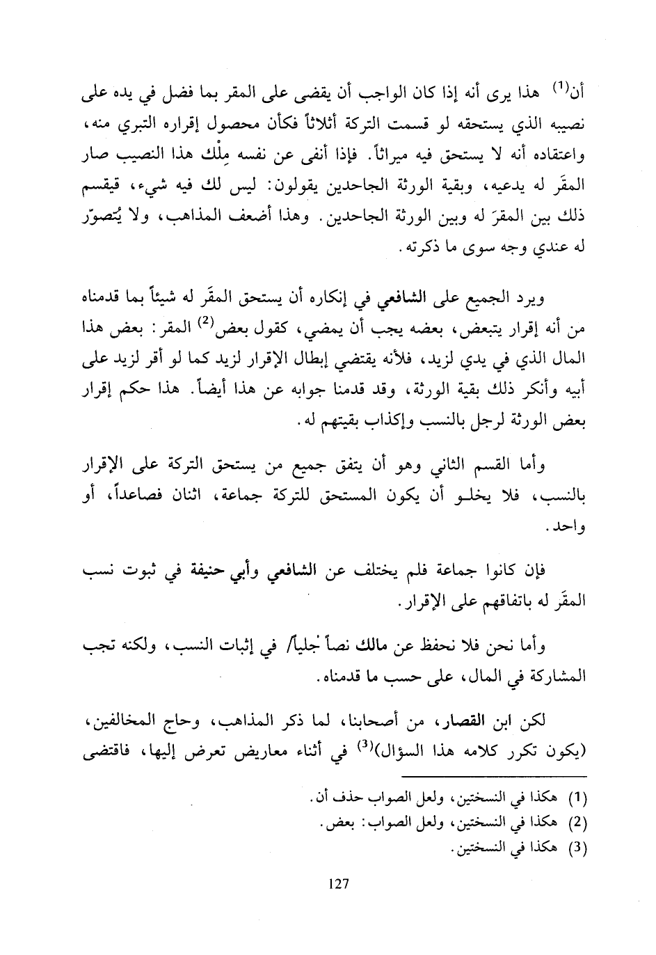 أن (¬1) هذا يرى أنه إذا كان الواجب أن يقضى على المقر بما فضل في يده على نصيبه الذي يستحقه لو قسمت التركة أثلاثًا فكأن محصول إقراره التبري منه، واعتقاده أنه لا يستحق فيه ميراثًا. فإذا أنس عن نفسه مِلك هذا النصيب صار المقَر له يدعيه، وبقية الورثة الجاحدين يقولون: ليس لك فيه شيء، قيقسم ذلك بين المقرَ له وبين الورثة الجاحدين. وهذا أضعف المذاهب، ولا يتُصوّر له عندي وجه سوى ما ذكرته.