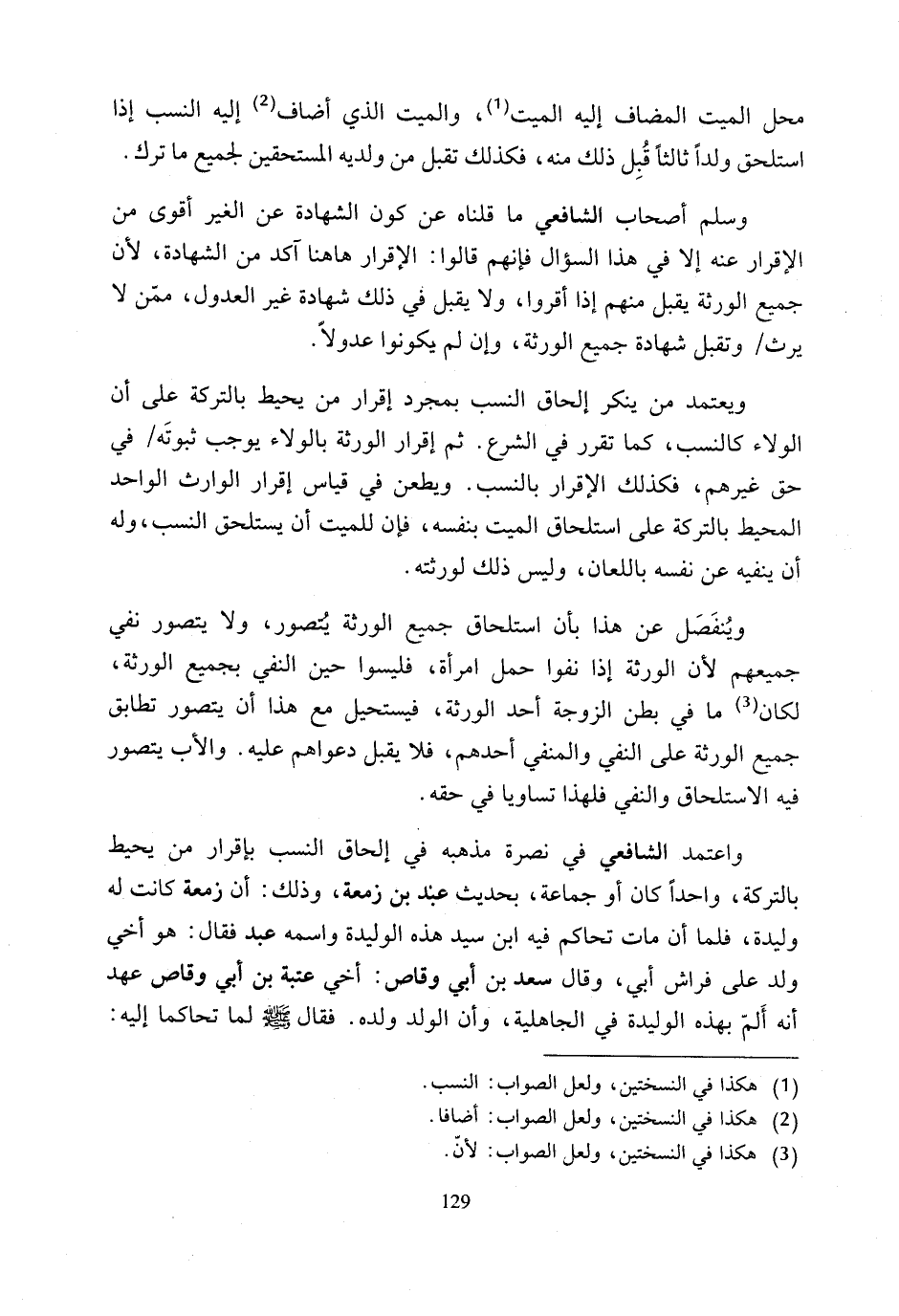واعتمد الشافعي في نصرة مذهبه في إلحاق النسب بإقرار من يحيط بالتركة، واحدًا كان أو جماعة، بحديث عبد بن زمعة، وذلك: أن زمعة كانت له وليدة، فلما أن مات تحاكم فيه ابن سيد هذه الوليدة واسمه عبد فقال: هو أخي ولد على فراش أبي، وقال سعد بن أبي وقاص: أخي عتبة بن أبي وقاص عهد أنه أَلمّ بهذه الوليدة في الجاهلية، وأن الولد ولده. فقال - صلى الله عليه وسلم - لما تحاكما إليه:
