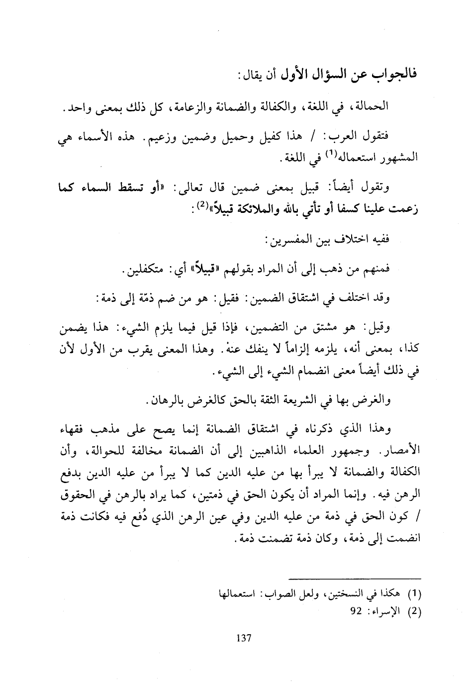 وهذا الذي ذكرناه في اشتقاق الضمانة إنما يصح على مذهب فقهاء الأمصار. وجمهور العلماء الذاهبين إلى أن الضمانة مخالفة للحوالة، وأن الكفالة والضمانة لا يبرأ بها من عليه الدين كما لا يبرأ من عليه الدين بدفع الرهن فيه. وإنما المراد أن يكون الحق في ذمتين، كما يراد بالرهن في الحقوق كون الحق في ذمة من عليه الدين وفي عين الرهن الذي دُفع فيه فكانت ذمة انضمت إلى ذمة، وكان ذمة تضمنت ذمة.