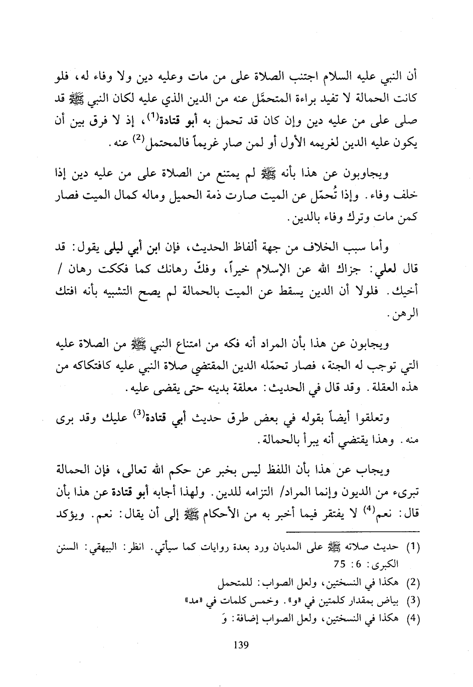 ويجابون عن هذا بأن المراد أنه فكه من امتناع النبي - صلى الله عليه وسلم - من الصلاة عليه التي توجب له الجنة، فصار تحمّله الدين المقتضي صلاة النبي عليه كافتكاكه من هذه العقلة. وقد قال في الحديث: معلقة بدينه حتى يقضى عليه.